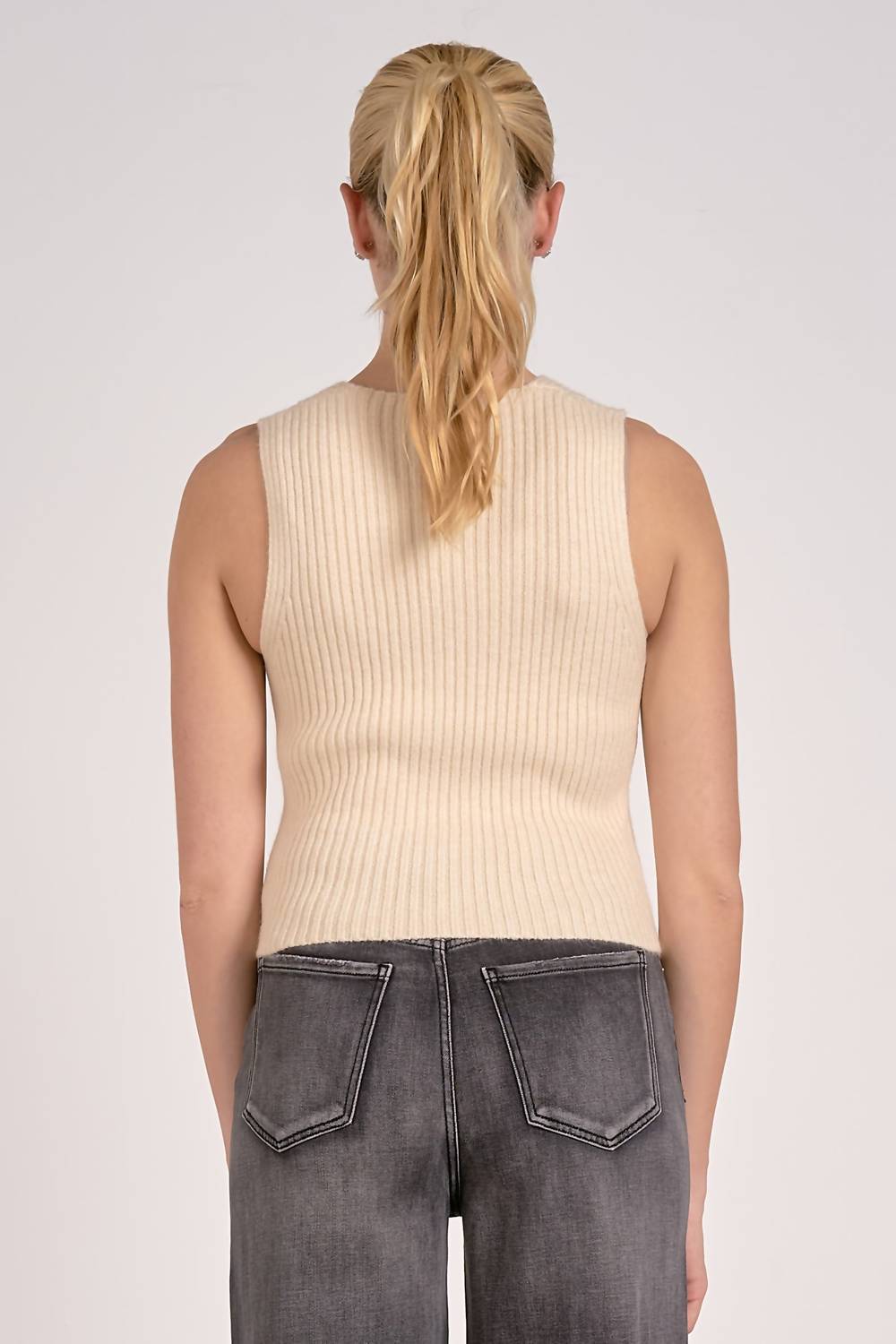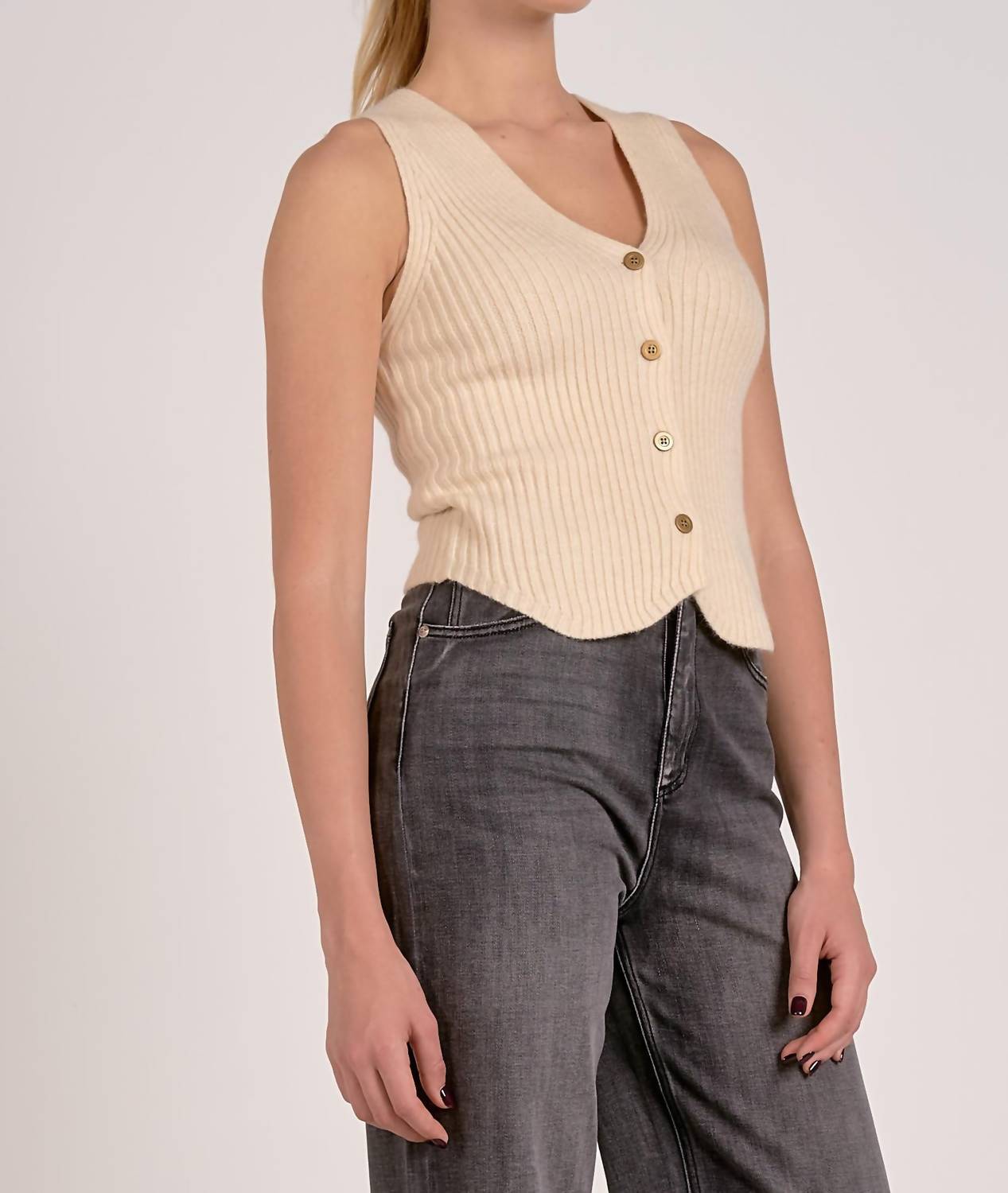 A timeless v-neck sweater that works season after season. Elevate your wardrobe with the Bella Sweater Vest by ELAN in a chic Cream hue. This sleeveless knit vest offers a timeless minimalist appeal, perfect for spring occasions like dinner parties. Featuring a flattering scoop neckline and button-front closure, it’s ideal for layering or wearing alone. Made from stretchy ribbed knit fabric, this versatile piece ensures stylish comfort every time you wear it.