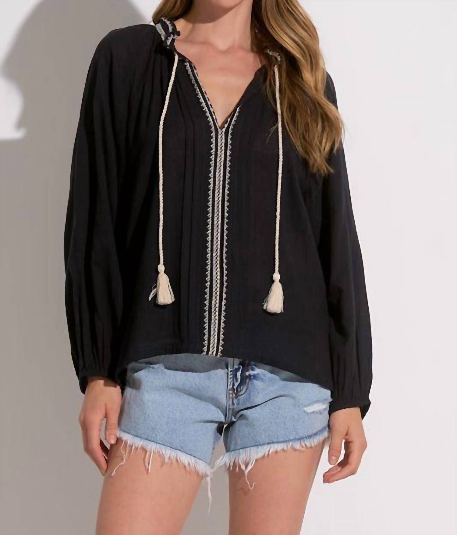 The Boho Babe Tassle Top by ELAN is the quintessential addition to your spring wardrobe for a touch of Bohemian chic. Crafted from 100% cotton, this patterned long sleeve tee in classic black showcases a V-neckline and tassel detailing for a unique style statement. Its pull-on design ensures effortless wear, while machine wash and tumble dry instructions make it easy to maintain. Ideal for vacation wear, this women's top offers comfort and flair for any occasion.