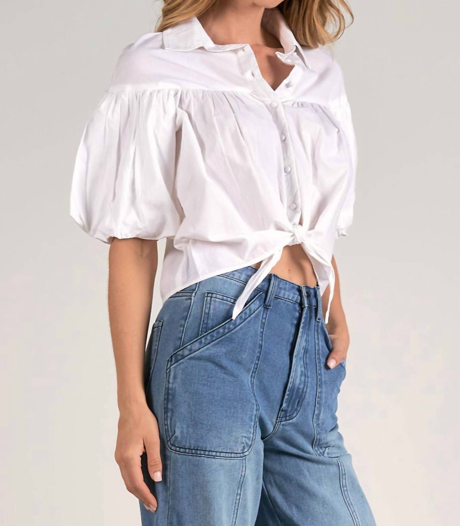 Pair this crop top with your favorite high-waisted jeans or maxi skirt. Button down closures. Te at the waist. Elastic pouf sleeves.