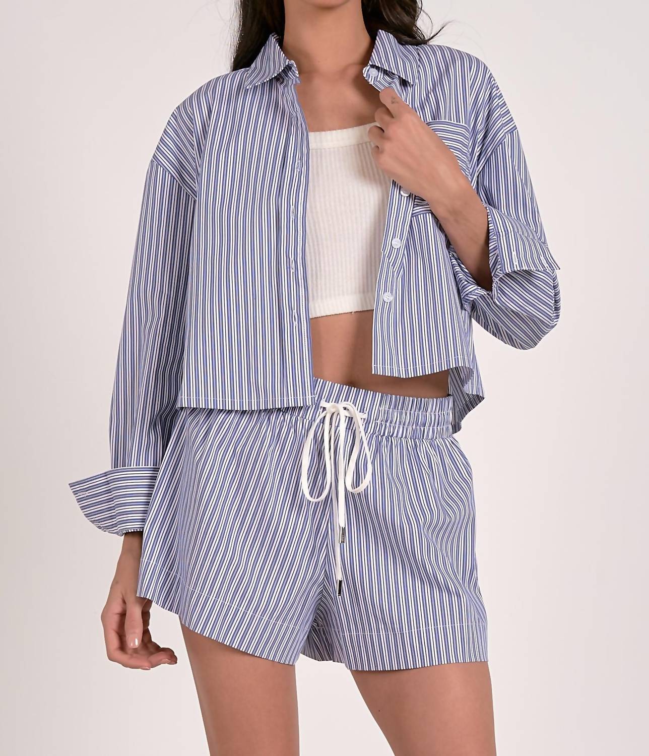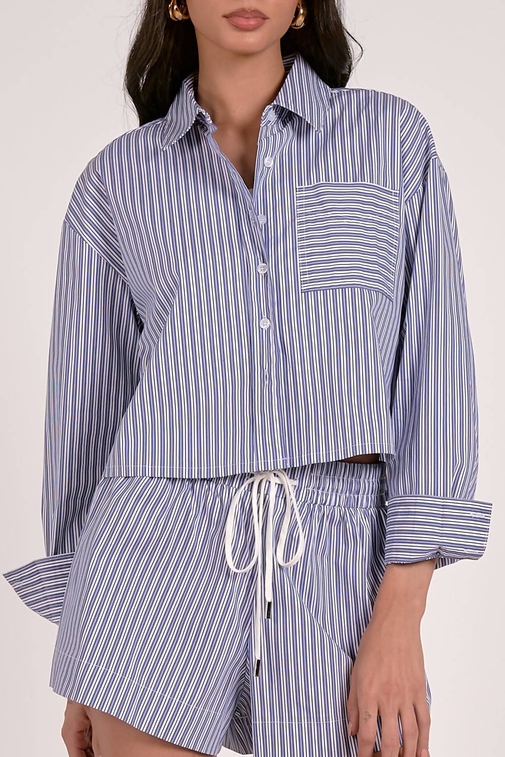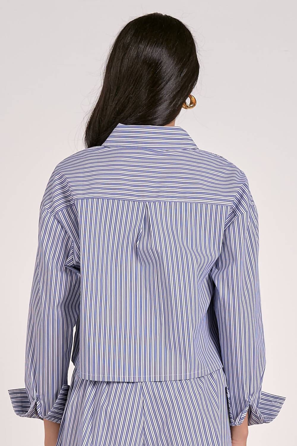 The perfect crop top for those warmer weather days. Introducing the Button Down Crop Top by ELAN, a chic addition to your spring wardrobe in a stylish navy stripe pattern. This women's top features long sleeves and a classic collared neckline, perfect for a minimalist look at your next dinner party. The functional design includes a pocket and a convenient button closure. Care instructions recommend machine washing and tumble drying for easy maintenance.