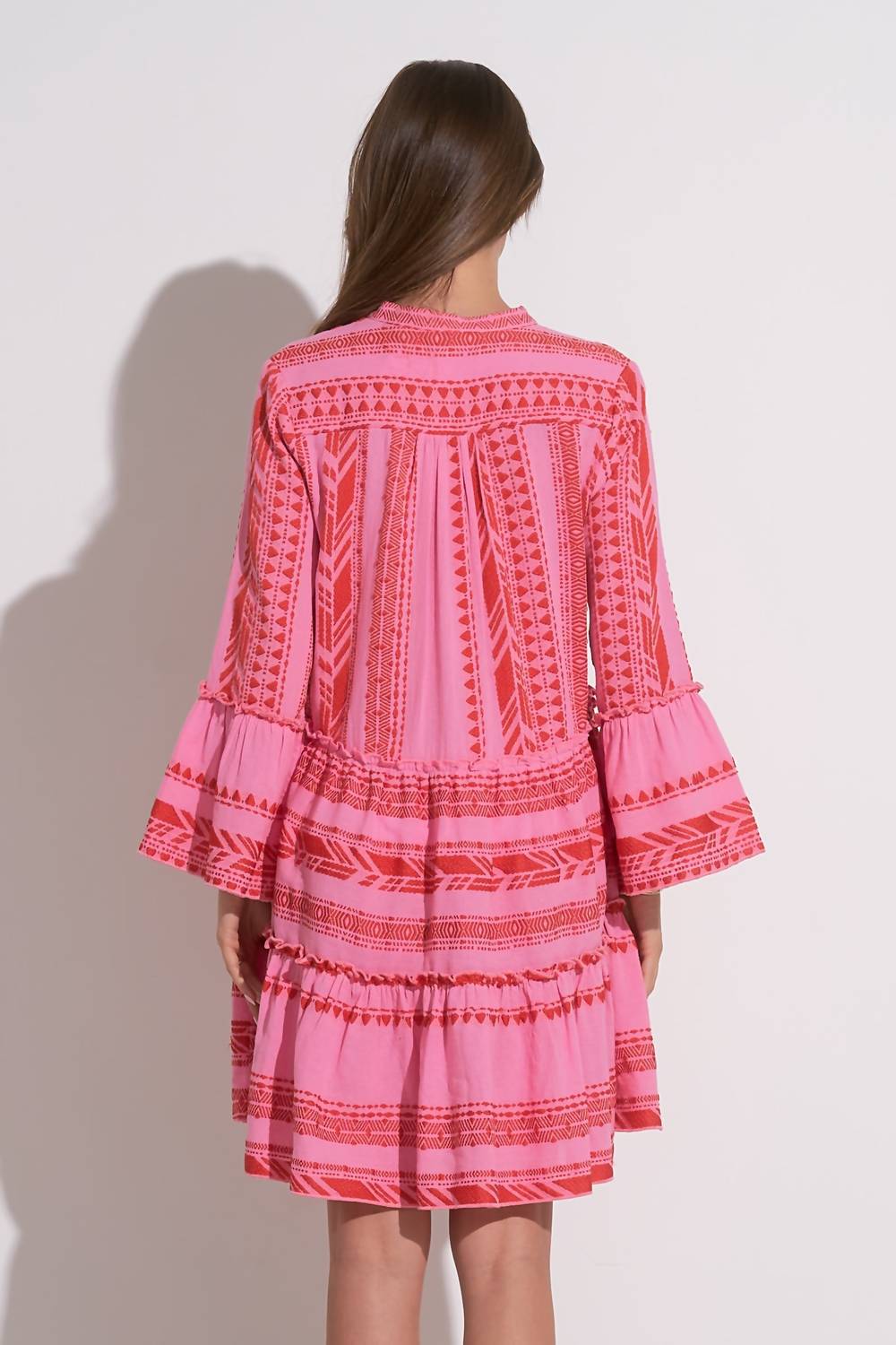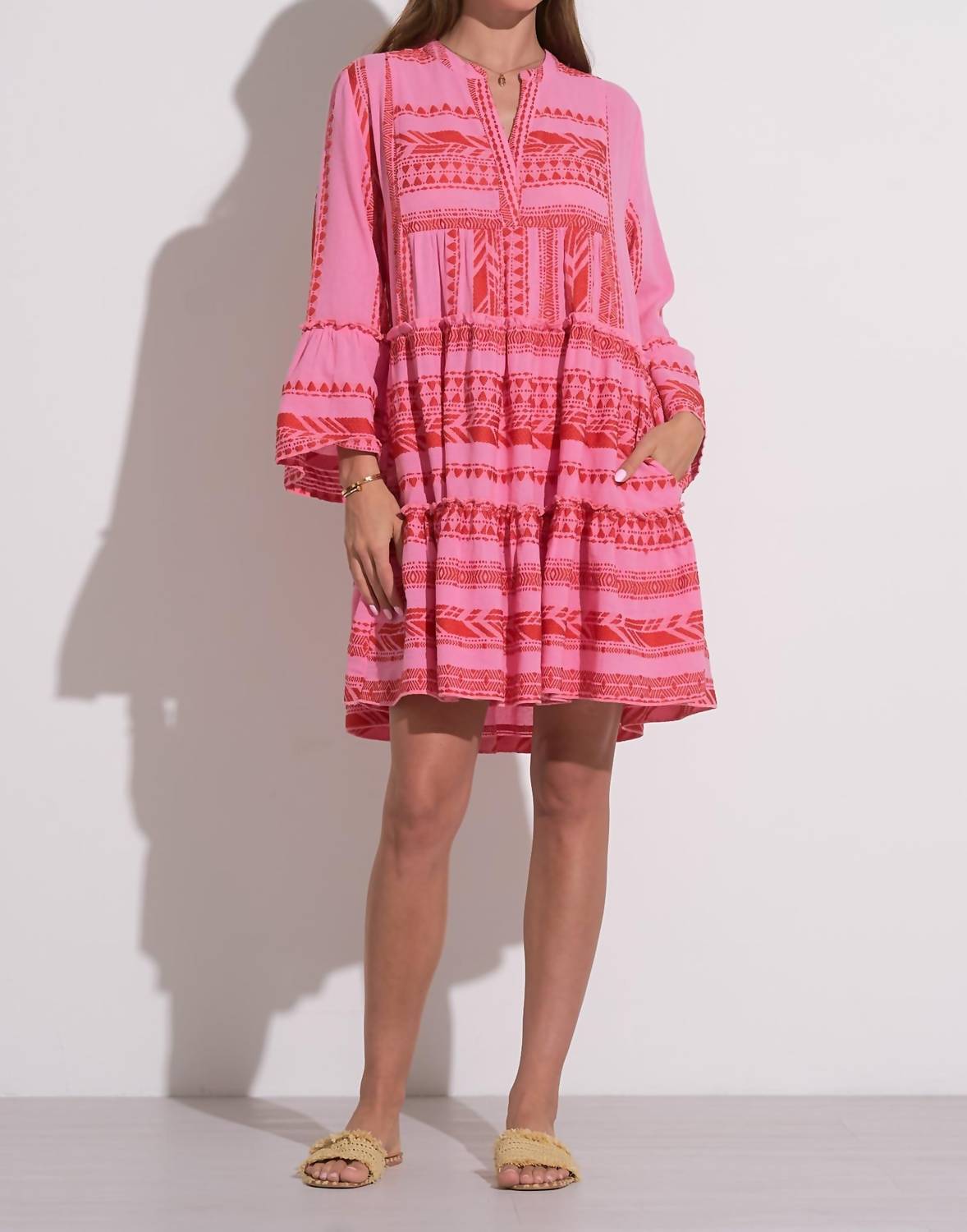 The kind of easy and flattering dress you'll be reaching for all season long. The Charli Mini Dress by ELAN is crafted with 100% cotton, showcasing a beautiful texture in a vibrant red two-tone pattern. Designed with long sleeves and a crewneck, this A-line silhouette offers a slouchy and relaxed fit, perfect for achieving effortless boho chic style. Equipped with convenient pull-on styling and two side pockets, it's ideal for vacation wear. Pair it with your favorite accessories for a stunning summer look.