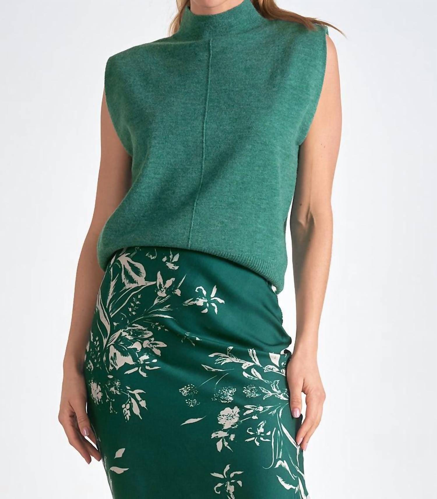 Fit to perfection and effortlessly chic. Elevate your style with the ELAN Chelcie Sweater, where sleek sophistication meets cozy comfort. This dark green sleeveless piece features a chic mock turtleneck with textured piping details, perfect for both work and play. Crafted from a blend of 44% Acrylic, 26% Polyester, 25% Nylon, and 5% Wool, it ensures warmth and style in every wear. Model is wearing a size small (5'9" height, 34" bust, 25" waist, 36.5" hips).