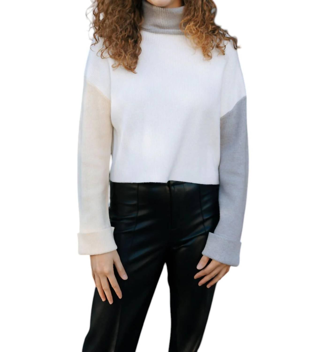 Effortlessly stylish piece. Natural, grey, and beige patterned design. Features a cozy, long sleeve design coupled with a chic turtleneck. Convenient pull-on closure. As comfortable as it is fashionable.