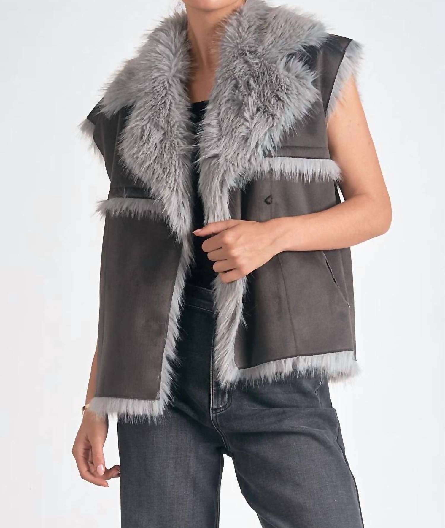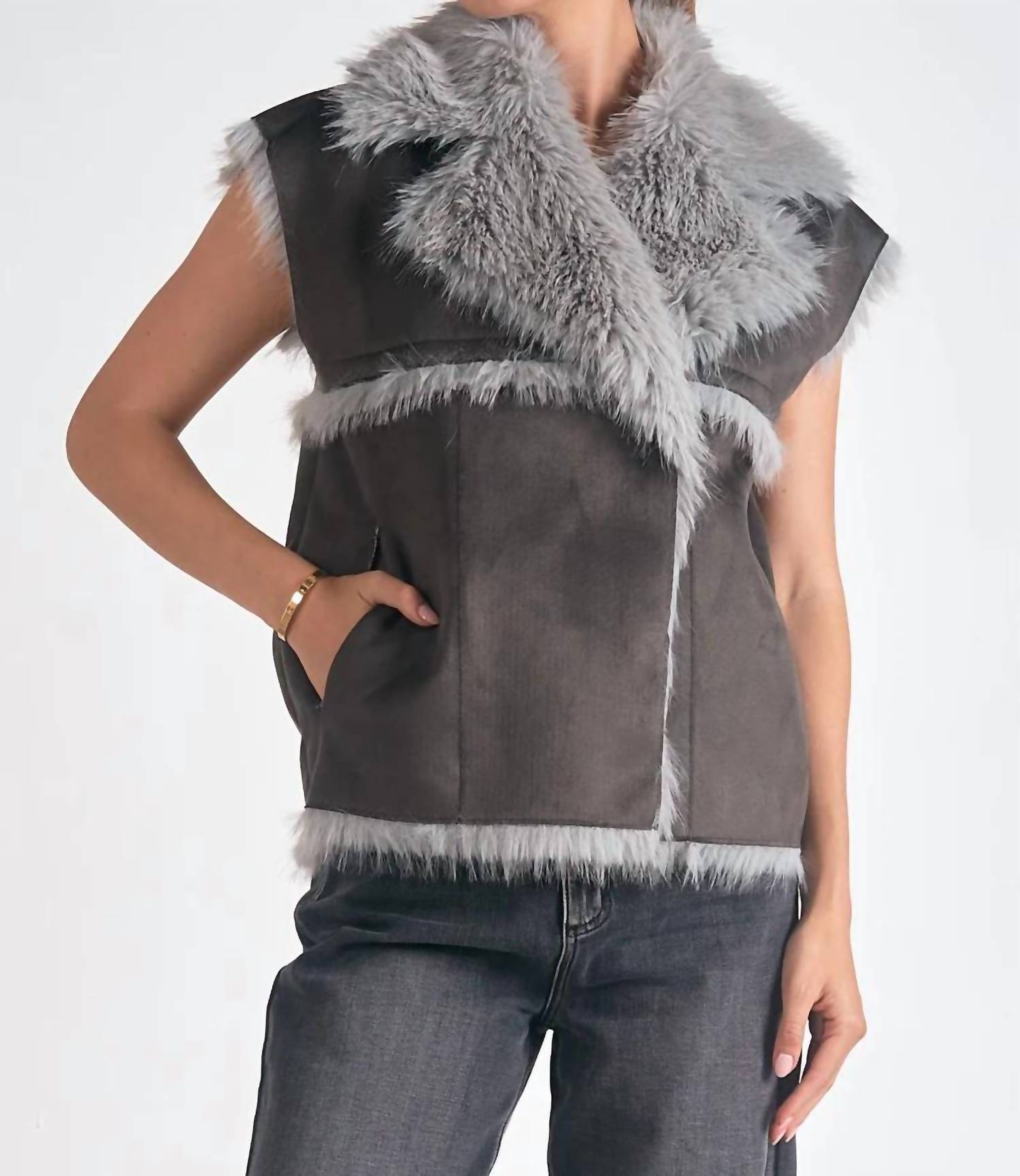 That extra layering piece you didn't know you needed! Exquisite piece crafted from 100% polyester for a luxe touch. Designed in a chic charcoal hue. Sleeveless vest features a dramatic jumbo collar with a suede-like finish. Button closure. Embrace effortless elegance.