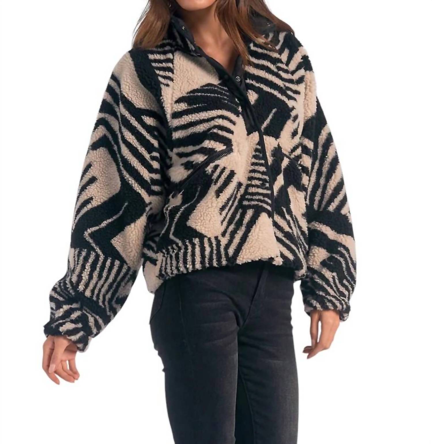Colder weather means jacket season and we are loving everything about this timeless teddy jacket. This cropped sherpa coat features long sleeves, a snap closure, and pockets. It has black and beige striped detailing with a zebra-style print. Made from 100% polyester. Length: 24" shoulder to bottom hem.