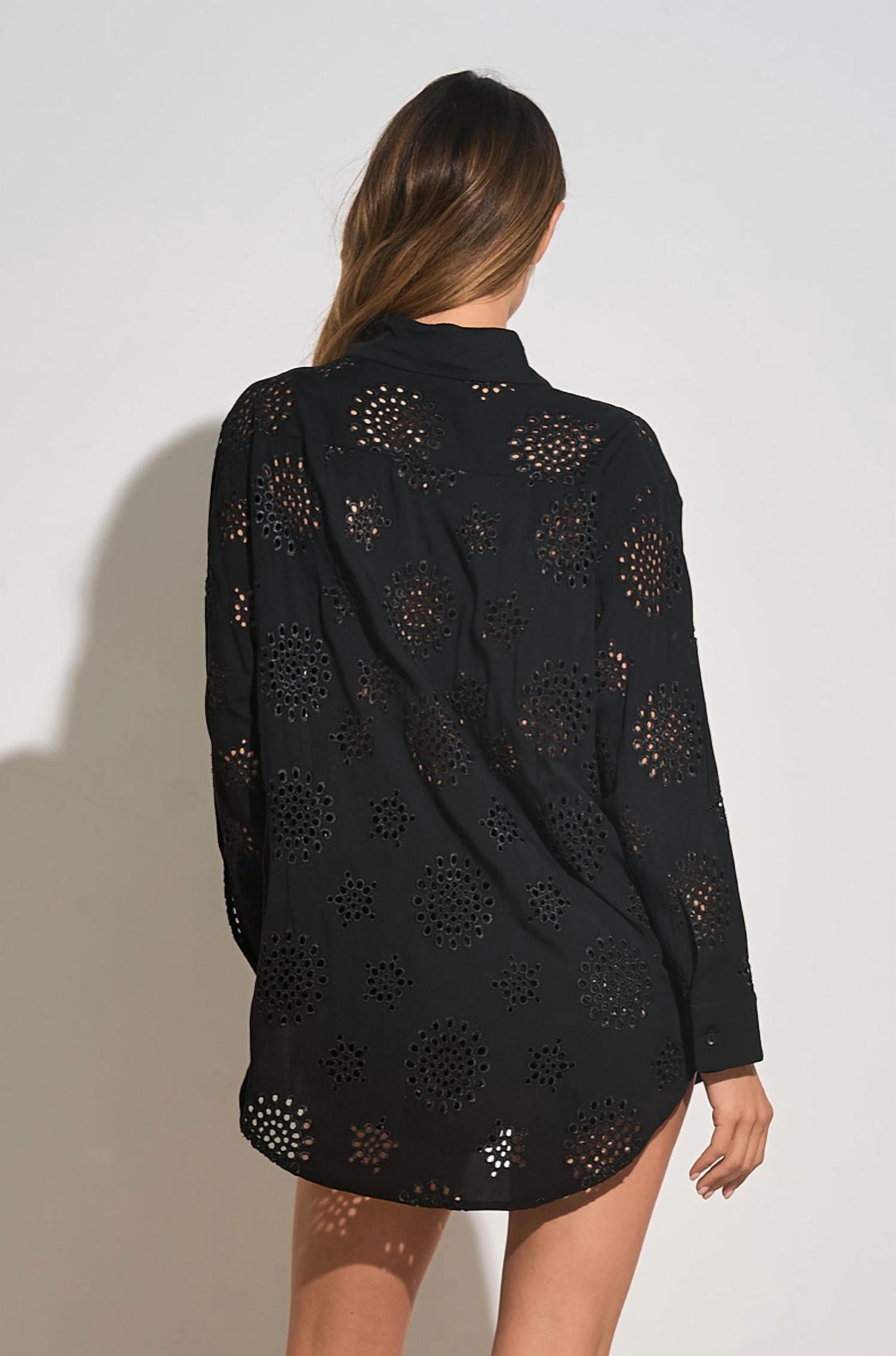 You're go-to coverup for pool parties, beach days and long weekends. The Erin Eyelet Button Down Cover Up by ELAN is an effortlessly stylish addition to your swimwear collection. Designed with a textured pattern, this women's cover-up in white brings a chic and laid-back vibe, perfect for beach days or poolside lounging. Crafted for comfort, its button-down design offers classic coverage and a boyfriend shirt silhouette. Care instructions include hand washing and line drying to maintain its effortless charm. The model, wearing a size small, measures 5'10" in height, with a bust of 32", waist of 24", and hips of 34.5".