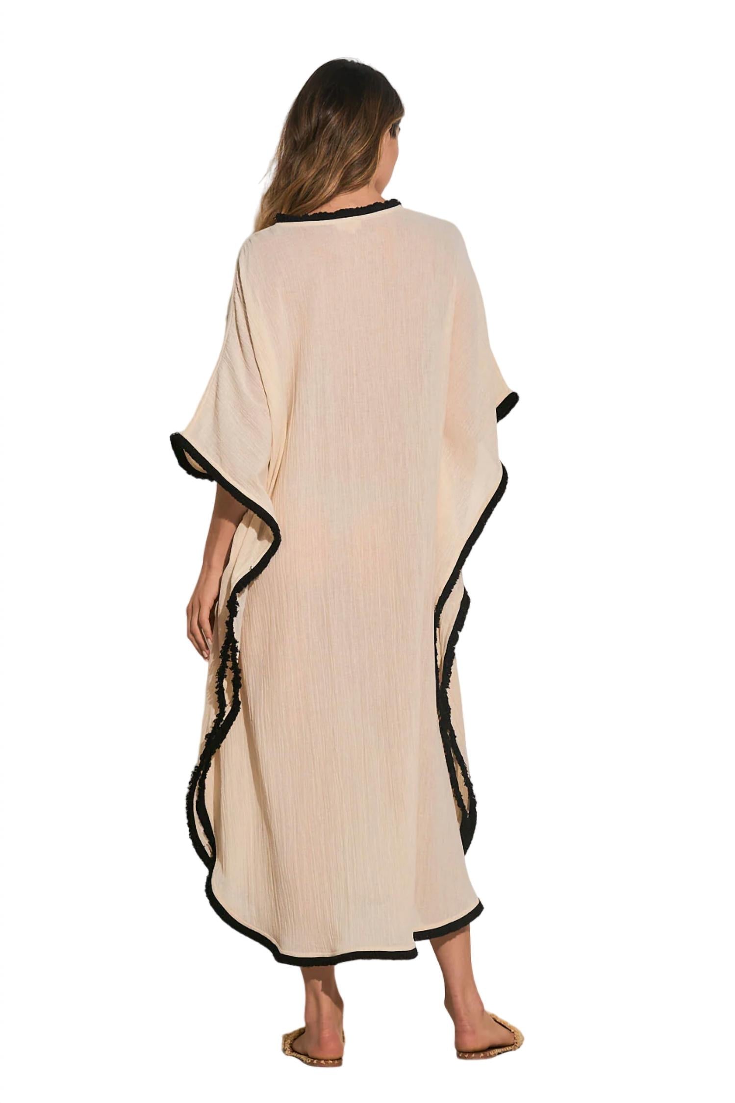 A maxi dress that is just as cute as it is comfortable.This kaftan features a deep round neckline and black 'fray' contrast detail throughout the body. It is maxi length and available in one size.