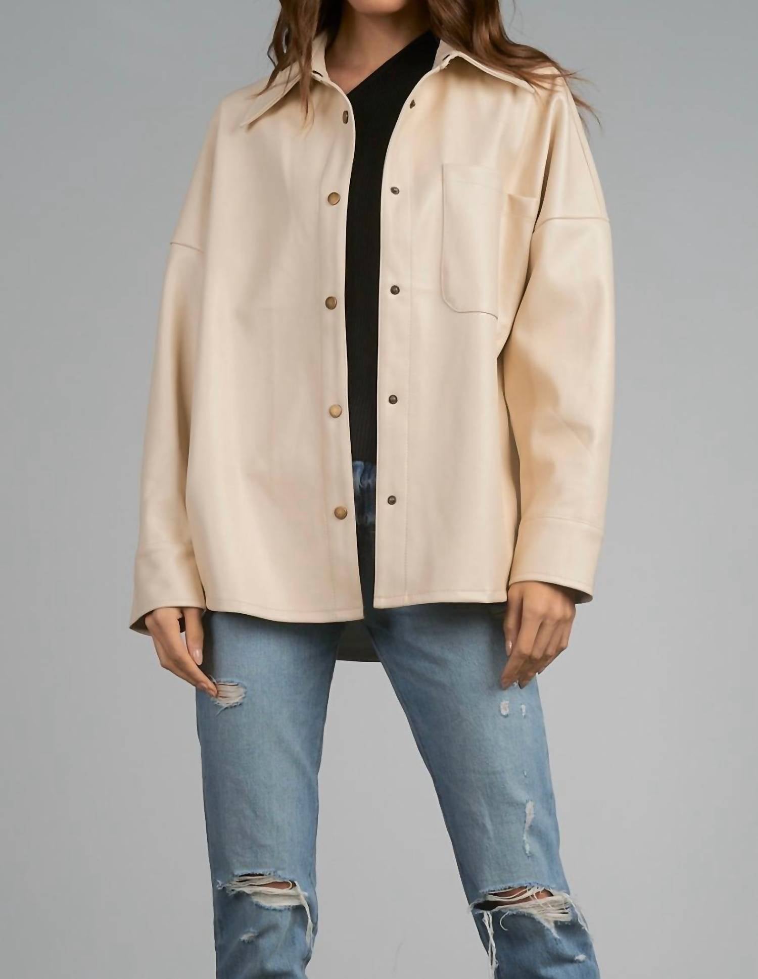 Soft leather, impeccable design. This leather jacket is a win-win. Sleek and polished. Oversized button down. Oversized. Faux leather. button down. Sleek look. Front pocket. Collard.