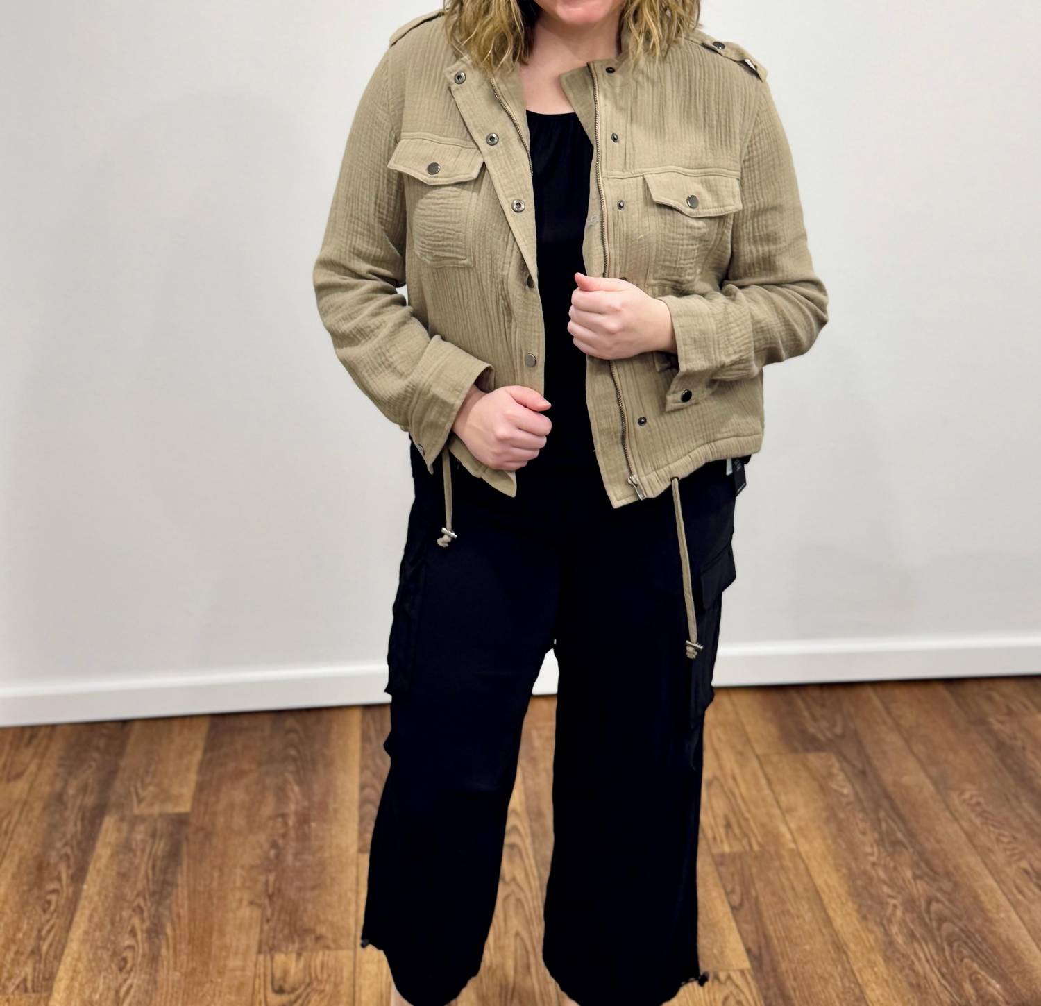 A jacket so versatile you can literally wear it with anything. Introducing the Gauze Snap Front Jacket by ELAN, an essential piece for streetwear enthusiasts. This khaki jacket features a textured pattern with long sleeves and a practical zip closure, making it a chic choice for both casual and music festival environments. Crafted from a cotton blend, it provides a versatile style with functional pockets, perfect for winter layering. Care involves hand washing and line drying, ensuring this timeless jacket remains a staple in your wardrobe.