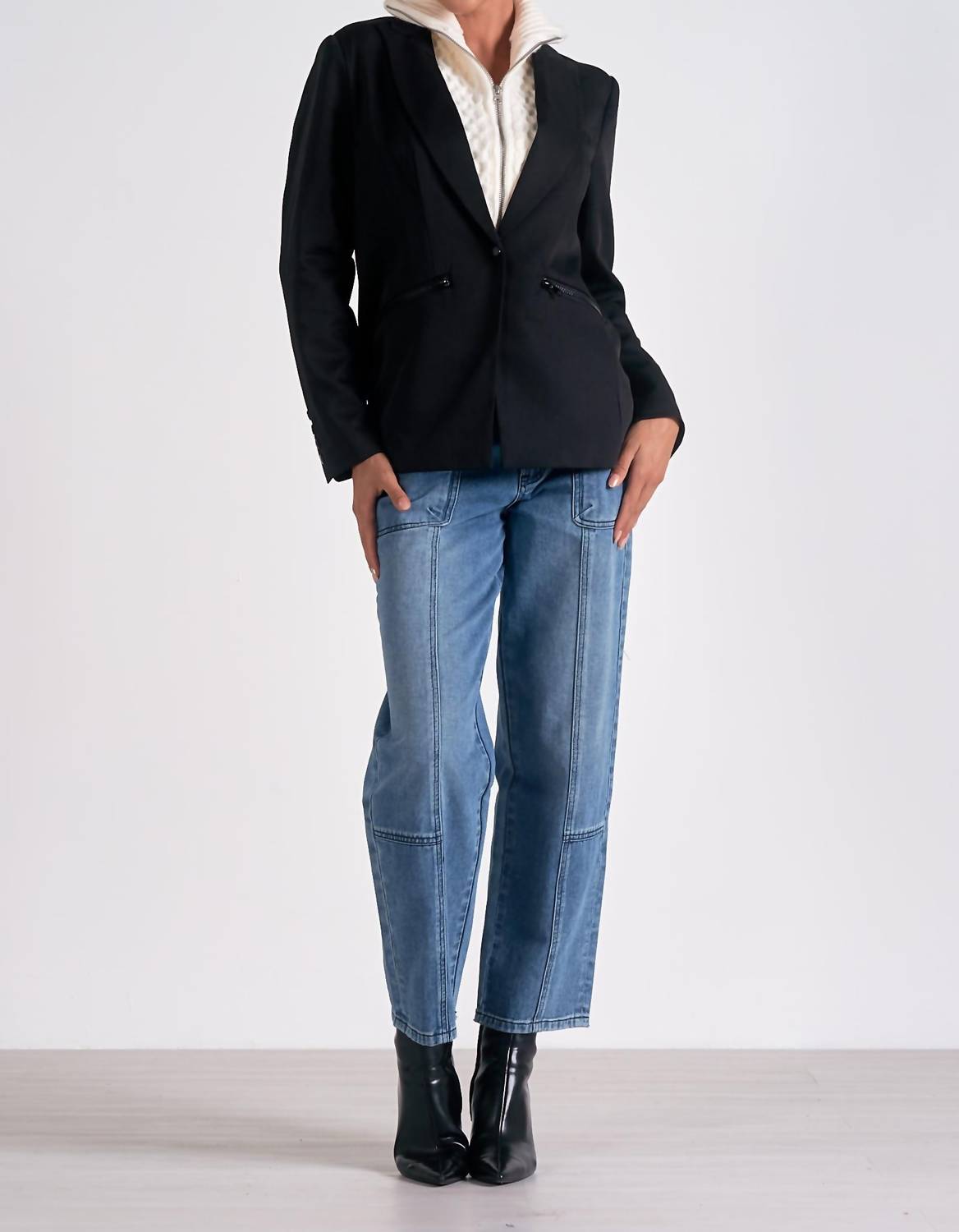 Cozy fabric, impeccable design - Meet the sweatshirt that you'll never want to take off. The Harper Blazer Hoodie by ELAN is an elegant and versatile piece that merges a classic blazer with the casual flair of a hoodie. With long sleeves and a zip closure, this garment offers both sophistication and comfort. Made of 100% polyester, it features a chic collar neckline and combines the contrasting colors of black and cream for a minimalist look. Perfect for a dinner party, this piece adds a refined touch to your wardrobe's spring collection.