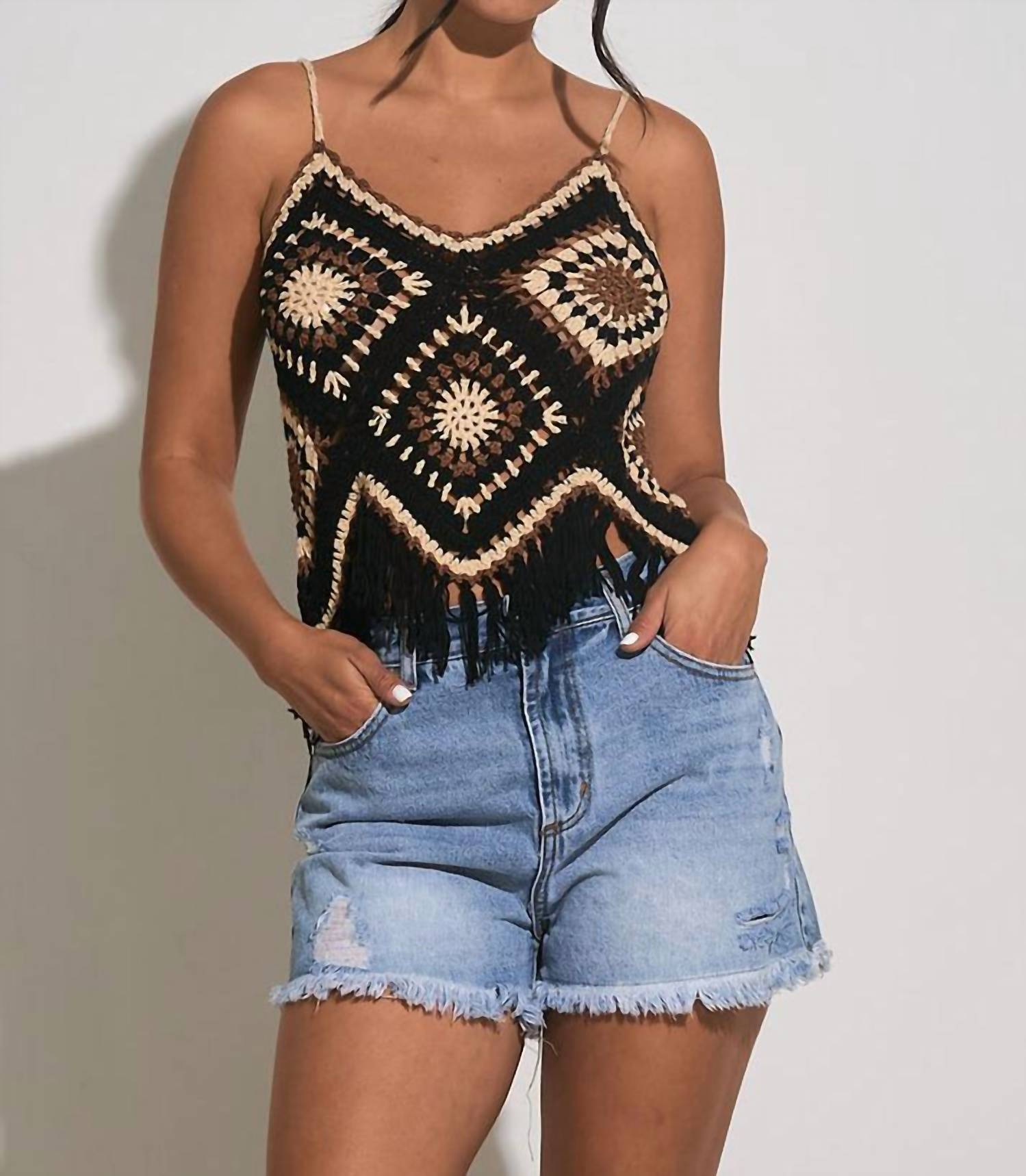 This classic tank top is perfect for layering and cute enough to wear on its own. Introducing the Island Crochet Tank with Fringe Bottom by ELAN, a boho-chic masterpiece that elevates any ensemble. This women's tank top features delicate spaghetti straps, a charming multicolor crochet design, and a playful fringe hem. Made from 100% Acrylic.