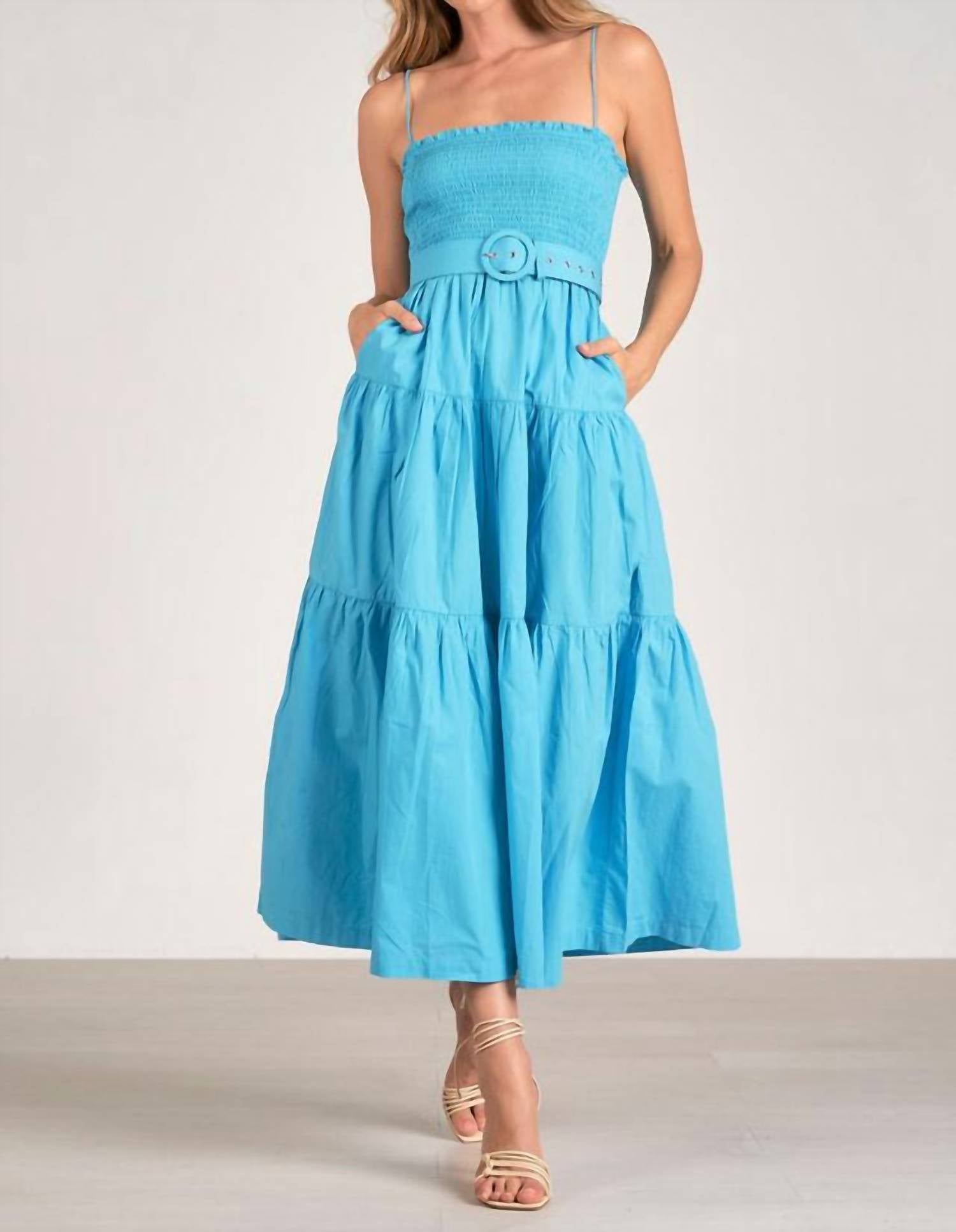 Introducing the Jillian Smocked Belted Midi Dress by ELAN, an azure masterpiece crafted from 100% cotton. This versatile sleeveless sundress features a square neckline with adjustable straps and a smocked bodice for a flattering fit. The relaxed, midi-length silhouette includes convenient pockets and a removable belt, making it an ideal choice for any spring or vacation occasion. Closure: Pull-on. Care: Machine wash cold, line dry, warm iron if needed.