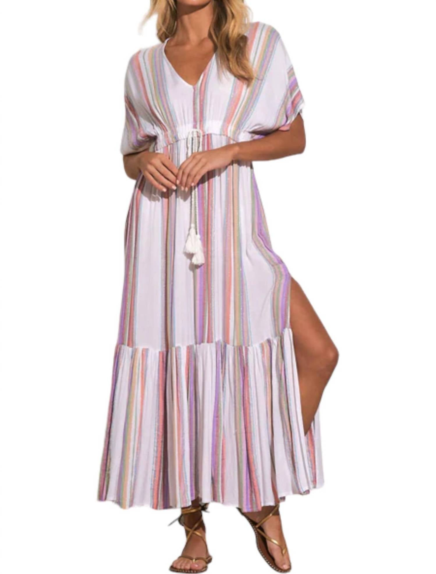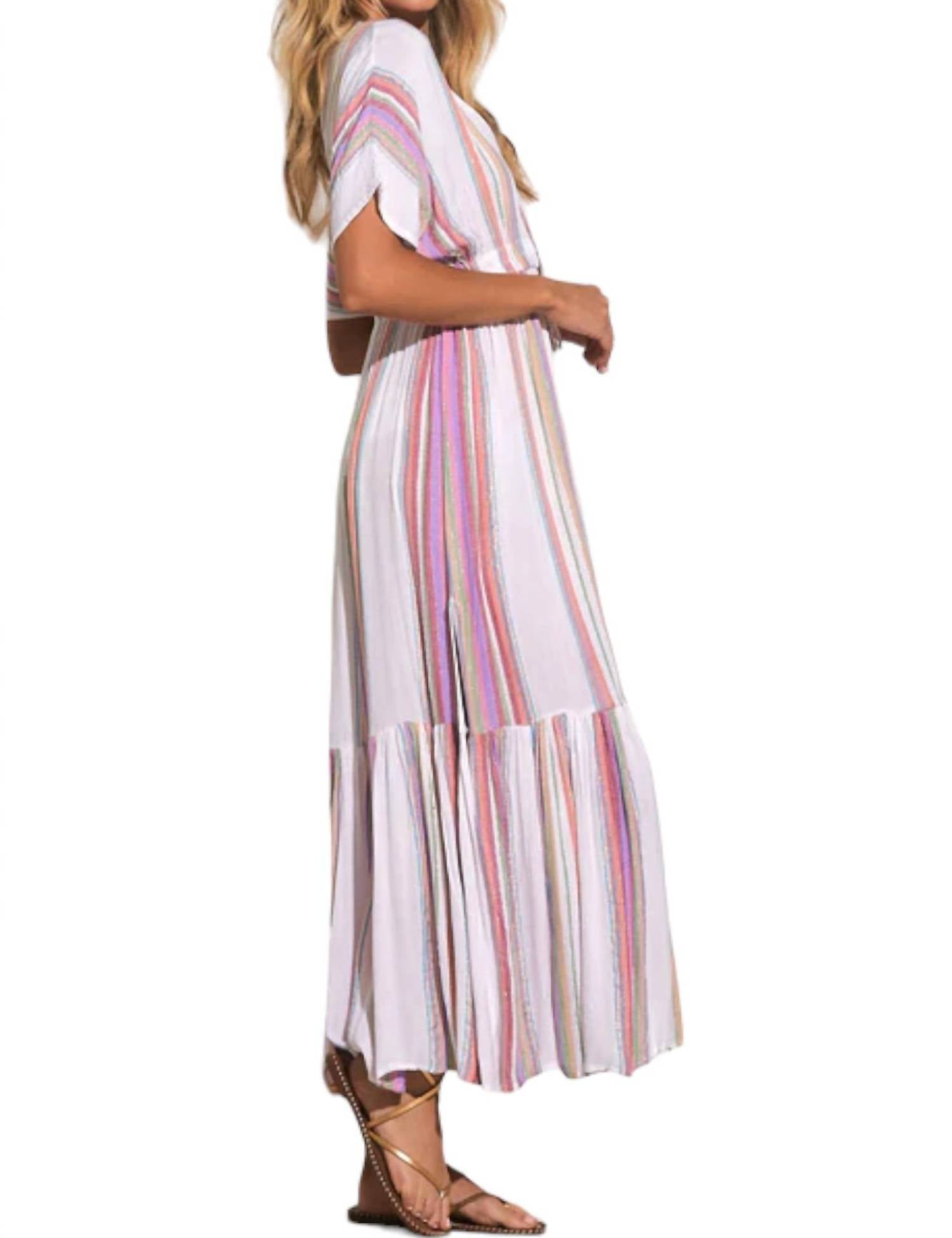 Who doesn't love a good maxi dress? This one you'll be reaching for season after season.Featuring a captivating white base. Adorned with playful pink and blue stripes. Perfect blend of casual sophistication and vibrant style. Flattering V-neckline. Short sleeves. Relaxed, airy feel. Designed in a maxi length. Flows beautifully. Pull-on closure.