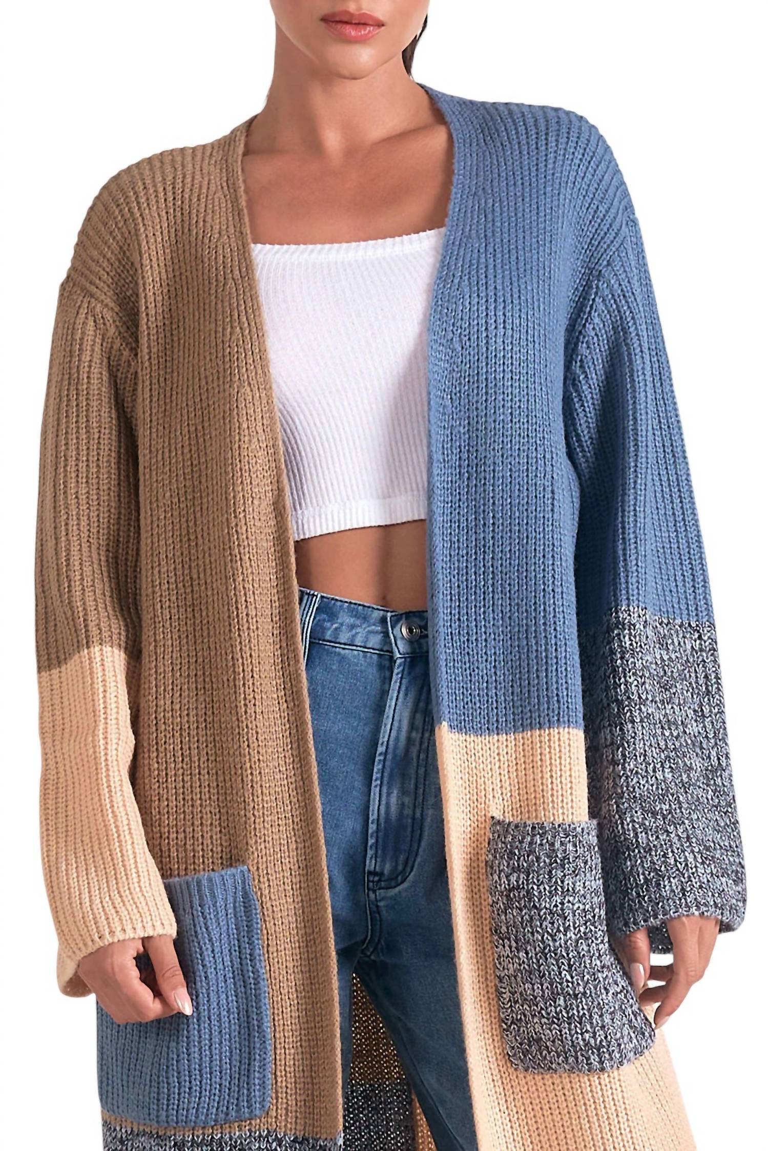 Elan - Long Colorblock Duster Sweater with Pockets