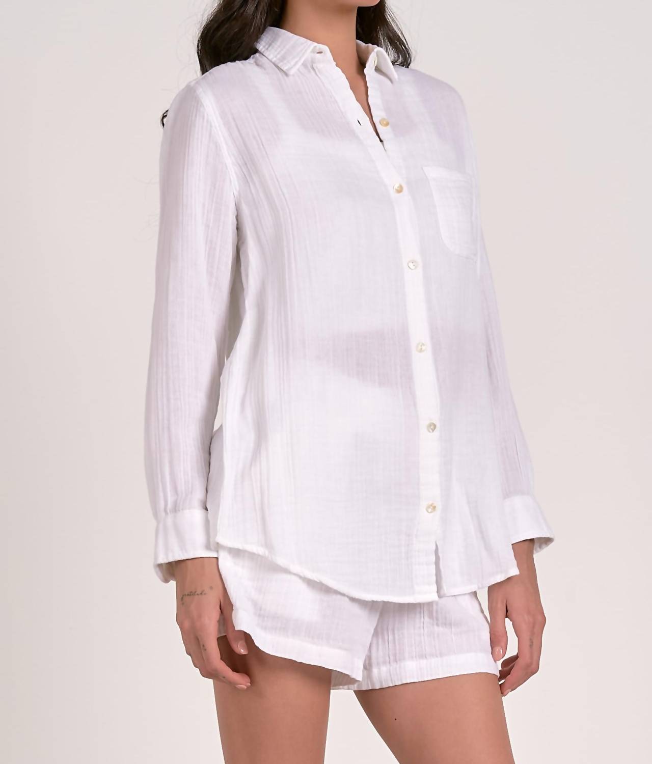 Introducing the Long Sleeve Button Down Top by ELAN, a perfect blend of sophistication and comfort for your workwear collection. This solid white shirt features long sleeves and a classic collar neckline, complete with convenient pockets for added functionality. Closure is seamless with a reliable button closure. Care is simple with machine wash and tumble dry instructions, making it an easy-to-maintain staple for Thanksgiving or engagement occasions.