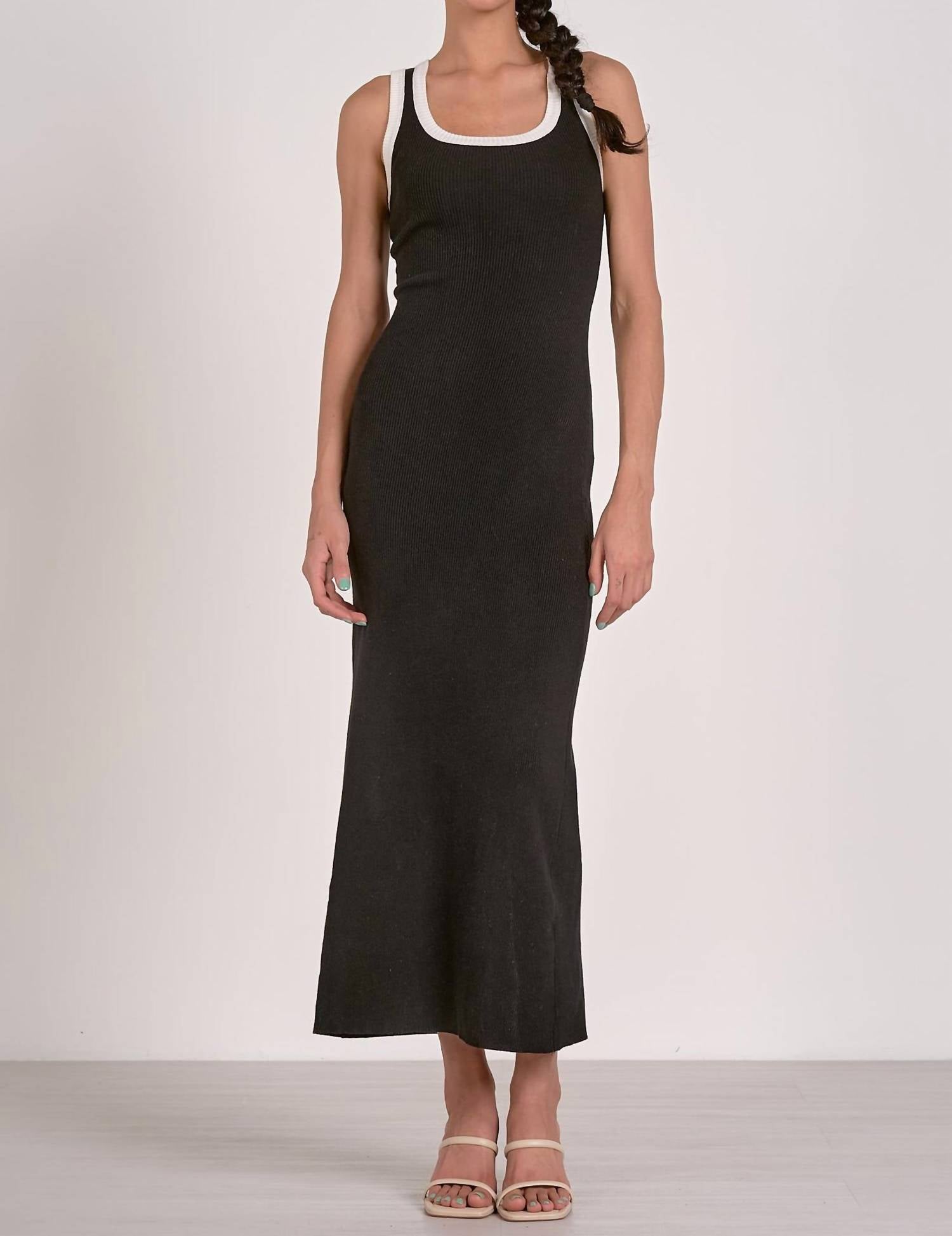Embrace timeless elegance with the Maxi Tank Dress by ELAN, featuring a sophisticated sleeveless design perfect for any occasion. Crafted in a solid black hue with delicate white trims, this dress offers a scoopneck and a subtle back split for added allure. Made with a bodycon silhouette, it's designed for a flattering fit. Care: Machine wash and tumble dry. Closure: Pull-on style. Ideal for holiday parties.