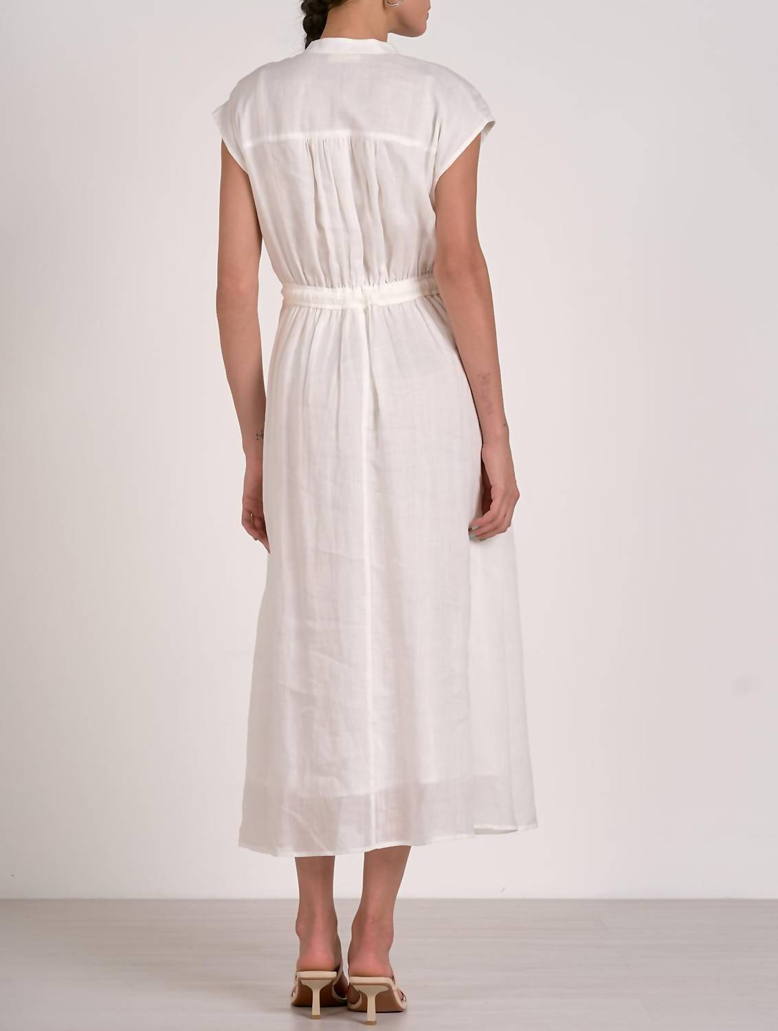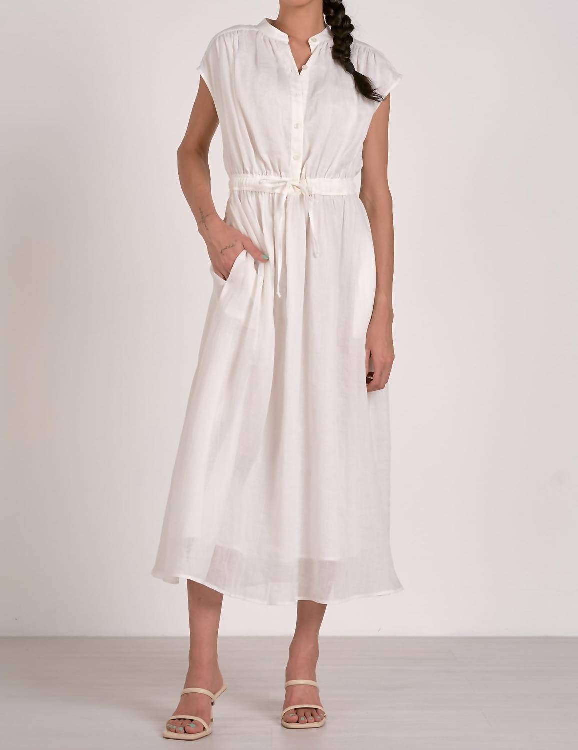 A midi dress so versatile, your options for wearing it are endless. The Midi Short Sleeve Tie Waist Dress by ELAN is an essential piece for any minimalist wardrobe, perfect for a spring vacation. In a solid white, this A-line dress offers a flattering silhouette with a tie waist and convenient pockets. It features short sleeves and a classic crewneck, complementing its button closure for easy wear. Made with practicality in mind, this dress is machine washable and can be tumble dried for effortless care.