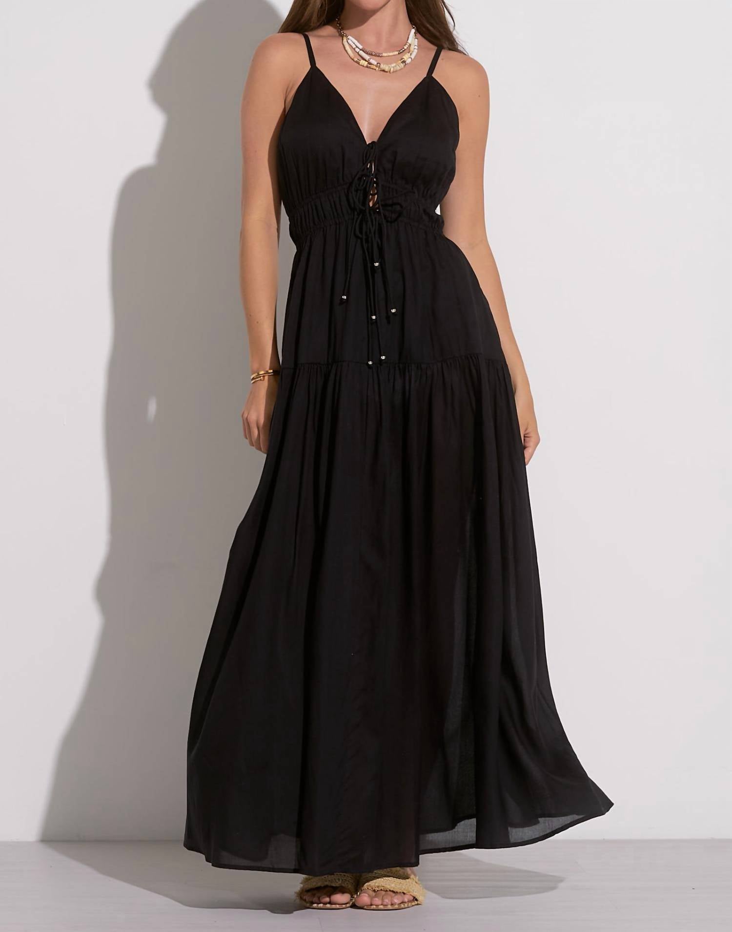 Style this maxi with your favorite statement necklace and sandals for the perfect look. Introducing the Milos Maxi Dress by ELAN, a chic addition to your wardrobe designed for elegance and comfort. This sleeveless dress is crafted from 100% Rayon in a stunning black hue, offering a refined silhouette with its plunging V-neckline and delicate spaghetti straps. The pull-on closure and cinched waist with adjustable ties ensure a flattering fit, while the tiered maxi skirt moves gracefully with every step. Perfect for spring dinner parties or special occasions, this dress exudes quiet luxury.
