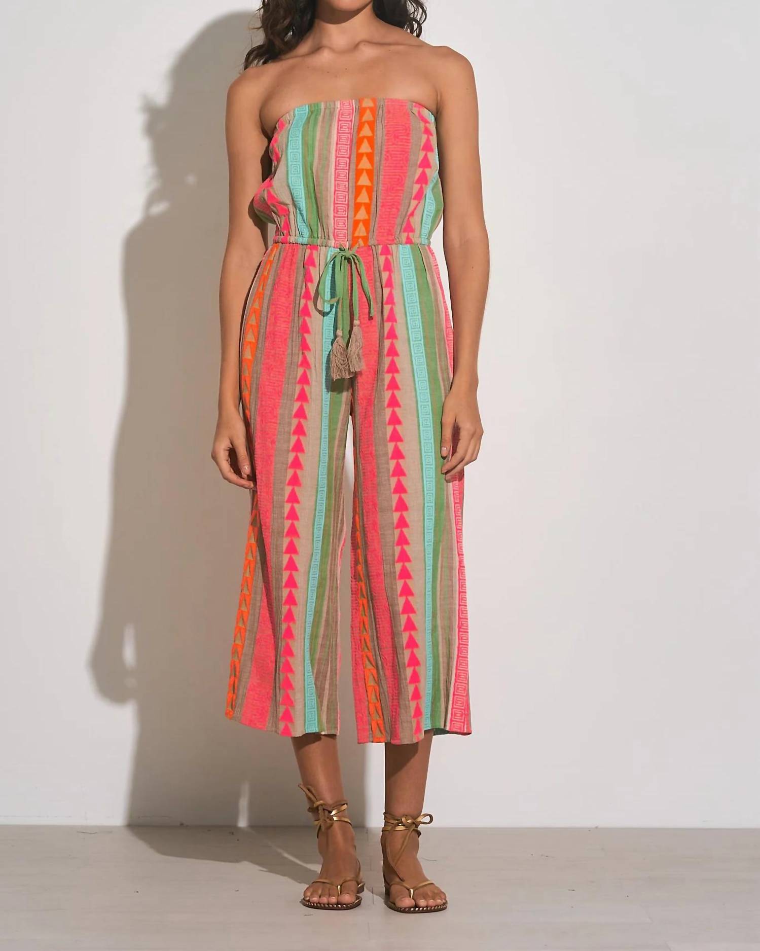 Wear these adorable capri pants with slides or cute flats for an effortlessly cool look. Step into summer with the "Caro" Strapless Jumper – the ultimate blend of comfort and style. This wide-leg jumper features a waist tie for a flattering silhouette and boasts a vibrant neon multicolor pattern, adding a playful touch to your look.