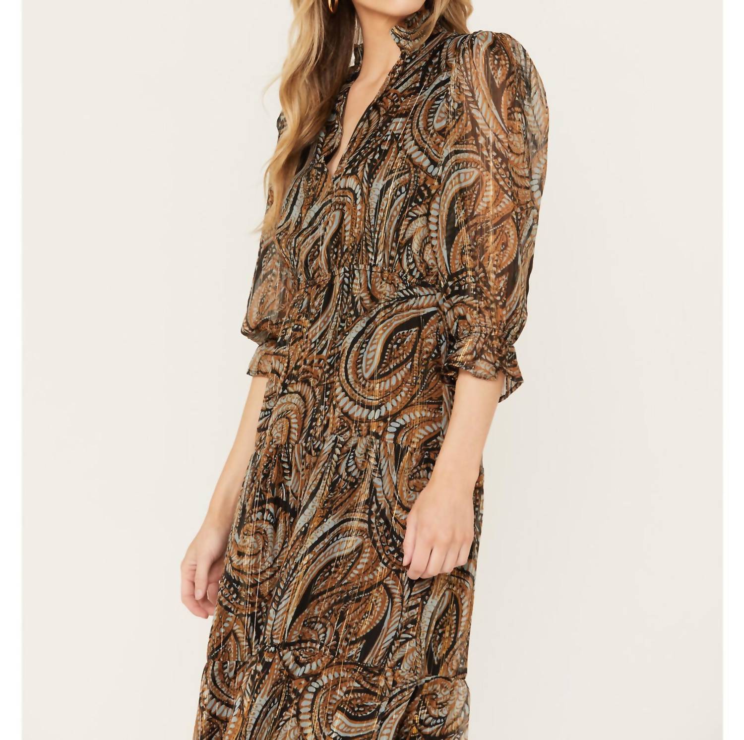 Paisley Print. Midi Length. Button Front. Relaxed Fit. Floral Details. Model is wearing a size small. 100% polyester. Smocked stand up collar with v neckline. Black with blue and brown paisley print with gold accents throughout. Elastic waist. 3-tiered skirt design. Machine wash cold, tumble dry low. Imported.