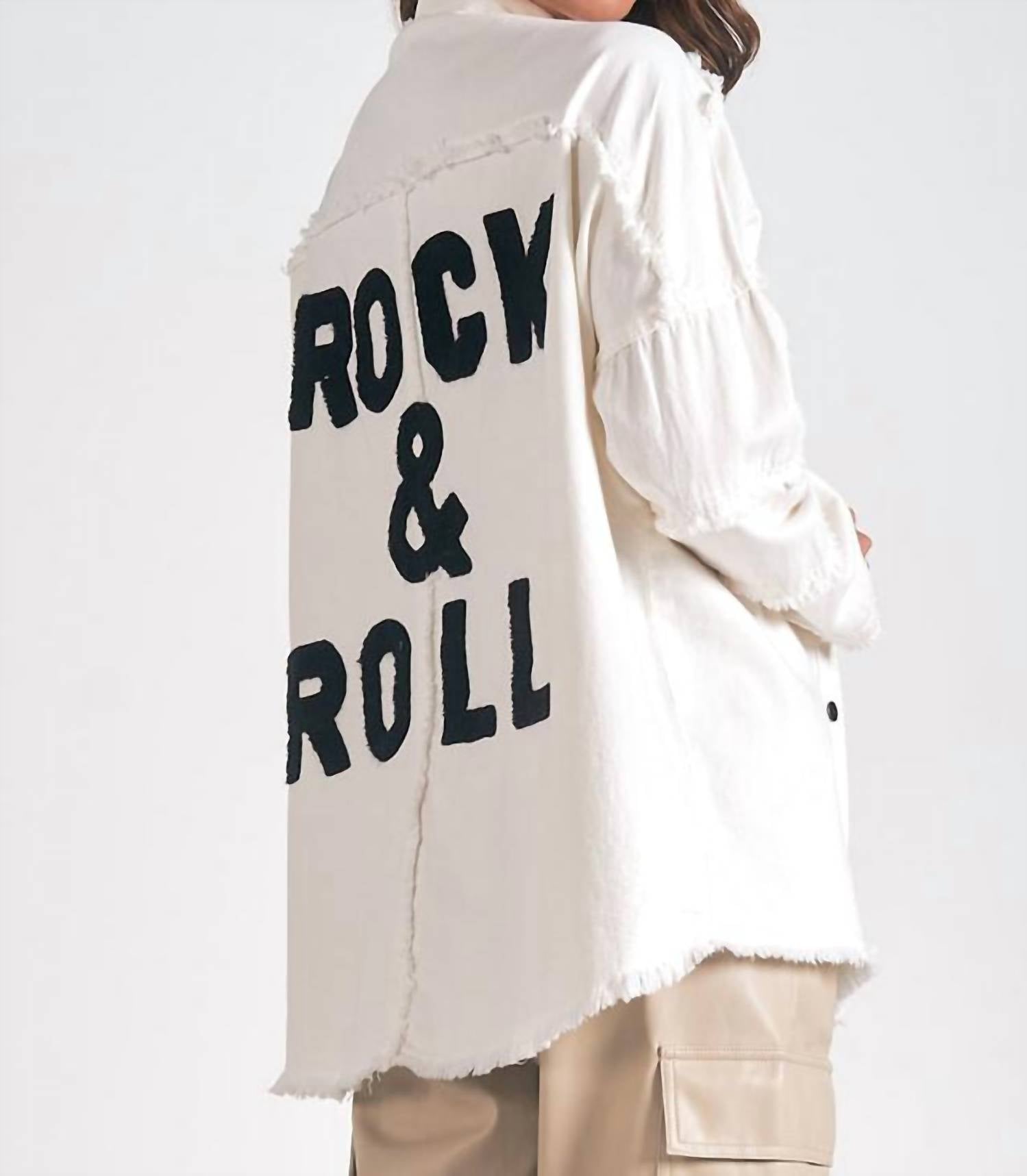 Introducing the ELAN Rock & Roll Shacket in White, your go-to casual jacket for effortless style. This women's shacket features long sleeves with vintage distressing, a graphic pattern, and a snap closure for easy wearing. Crafted from 100% cotton, it offers comfort and breathability. Care is simple with machine wash, low heat tumble dry, and medium heat ironing instructions. Perfect for a concert or a cool Thanksgiving ensemble, this oversized piece is a standout addition to your autumn wardrobe. Model is 5'10" with a 34" bust, 24" waist, and 36" hips, wearing a size small.