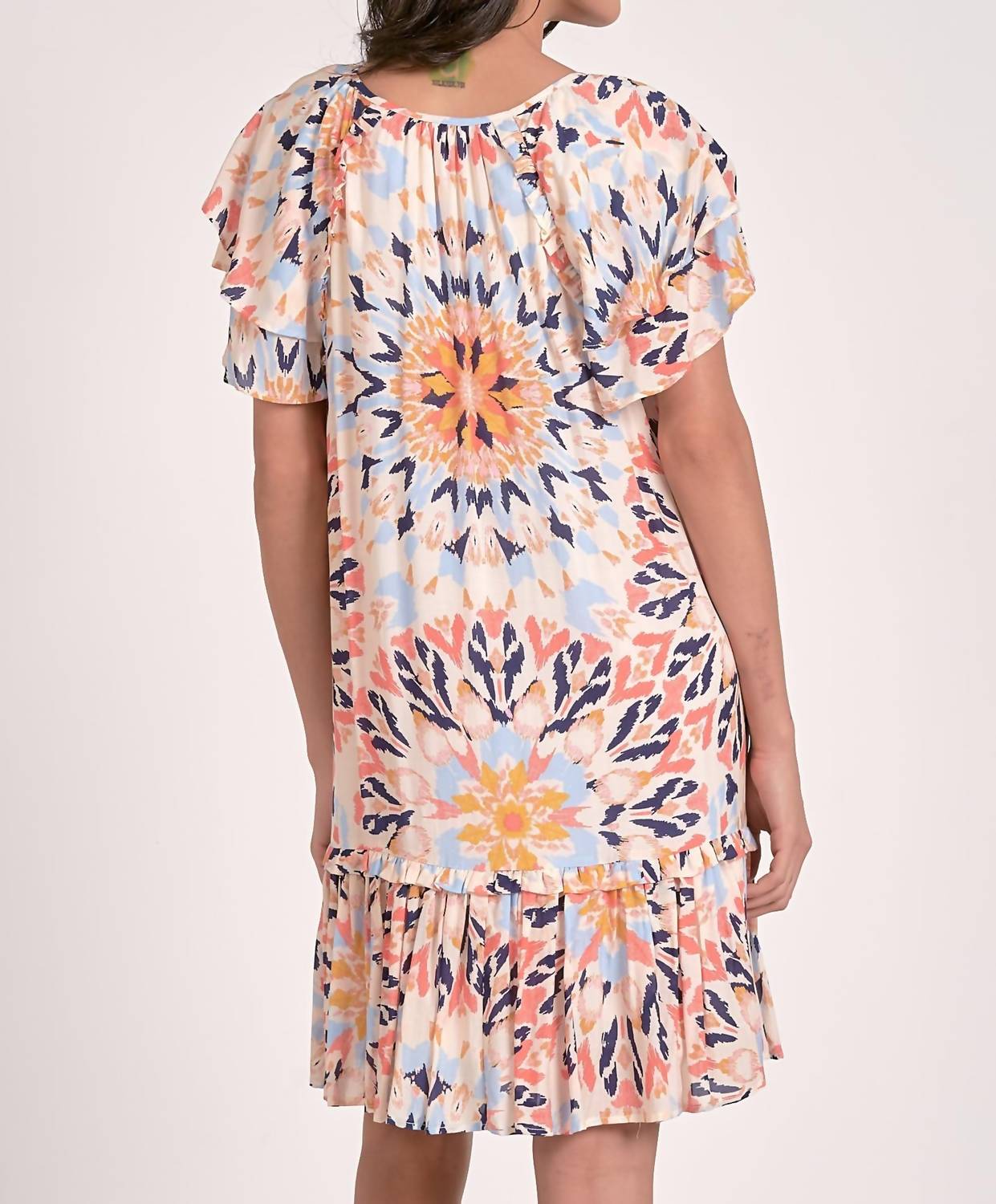 Discover the vibrant Ruffle Sleeve Mini Dress by ELAN, a patterned multi-color statement piece perfect for vacation vibes. This women’s dress boasts cap sleeves with a playful ruffle detail and a comfortable shift silhouette. Crafted from 100% cotton and lined with a 100% viscose shell, it features a convenient tie closure. Made for summer days, care for this dress by hand washing and line drying to maintain its maximalist charm.