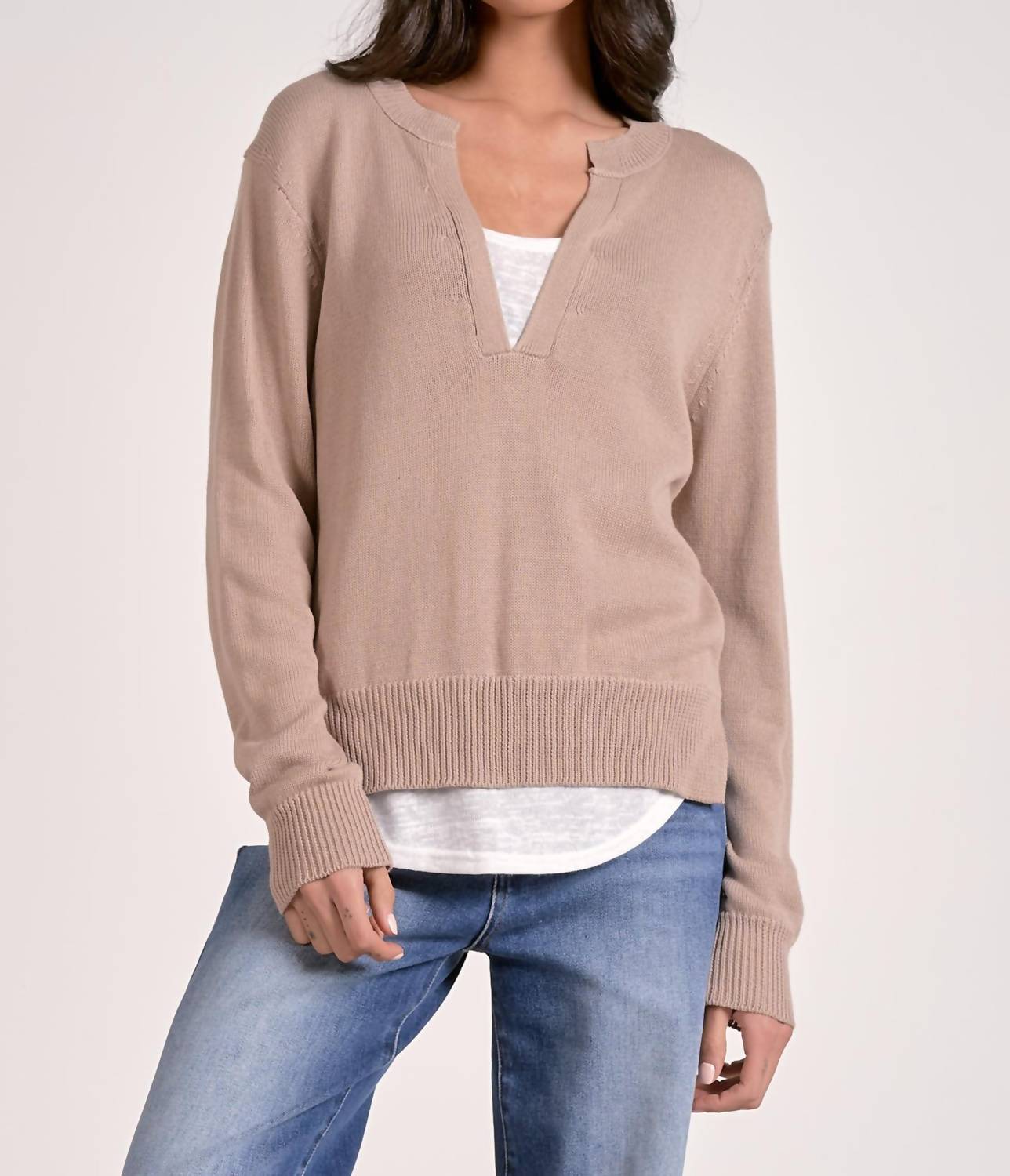 A timeless v-neck sweater that works season after season. Introducing the Sally Sweater by ELAN in a sophisticated two-tone Oatmeal White, perfect for a minimalist fall look. This long sleeve V-neck is made from 100% cotton, providing comfort and style with its layered hem detail. With a pull-on closure, it's designed for everyday ease, suitable for a casual day out or a chic holiday party. The model wears a size small, standing at 5'10" with measurements of 32" bust, 24" waist, and 32" hips.