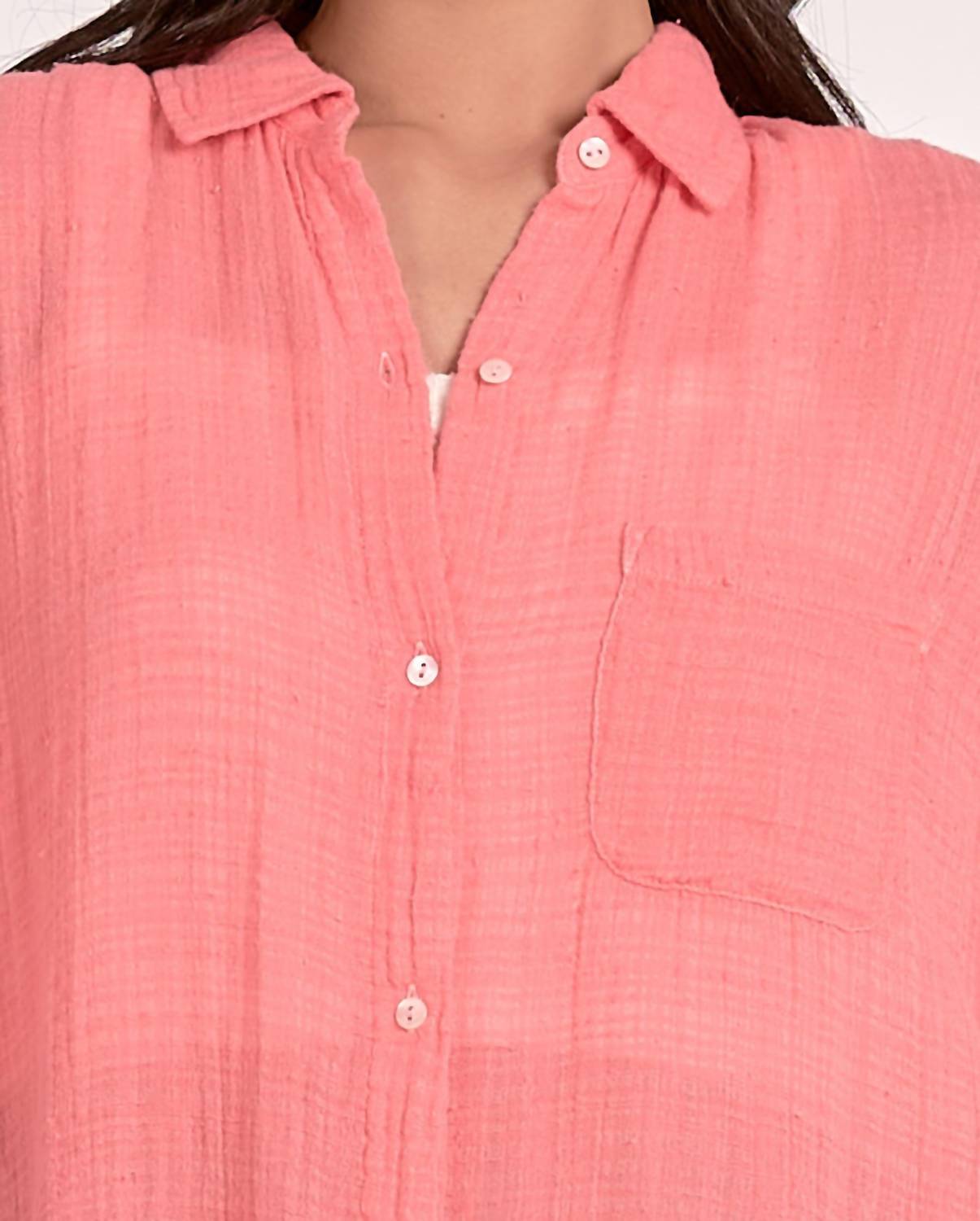 Introducing the Short-sleeve Button Down Top by ELAN, an effortlessly stylish addition to your summer wardrobe in a refreshing Coral hue. This women’s top features short sleeves, a classic collar neckline, and a solid pattern, making it perfect for a variety of occasions including vacations and Thanksgiving gatherings. Closure: Button closure. Care Instructions: Machine wash.