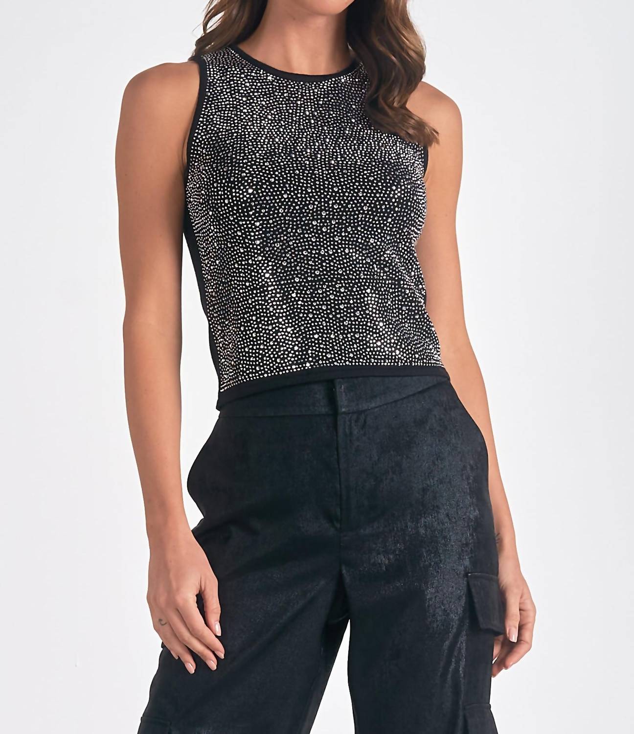 Experience the luxurious brilliance of the Sleeveless Sweater Tank Top by ELAN, crafted for women who appreciate elegance. This top is sleeveless and made from a finely knit fabric composed of 52% viscose, 28% polyester, and 20% polyamide, ensuring comfort and style. Adorned with dazzling rhinestones on a classic black solid pattern, it features a scoop neck and pull-on closure for easy wear. Machine washable for your convenience, it's the perfect fall addition for workwear trends or Thanksgiving travel occasions.