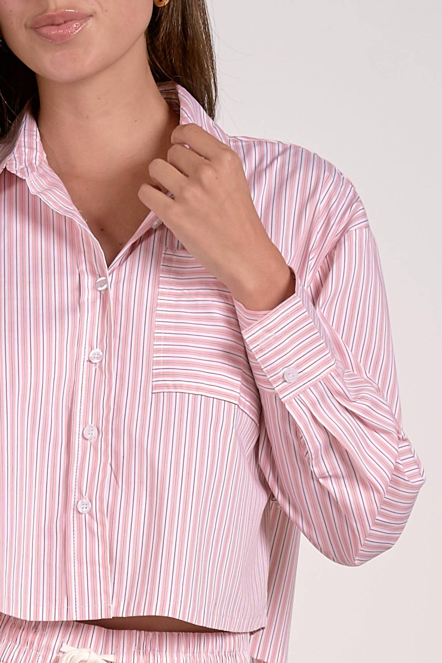 The Stripe Button-up Top & Shorts Set by ELAN is an essential addition for any fashion-forward wardrobe. This pink set features a long sleeve, collared crop top, and matching elastic waist shorts for a chic and comfortable look. Ideal for vacation or casual outings during summer, it's both versatile and stylish with its striking striped pattern. Care is easy with machine wash and tumble dry instructions.