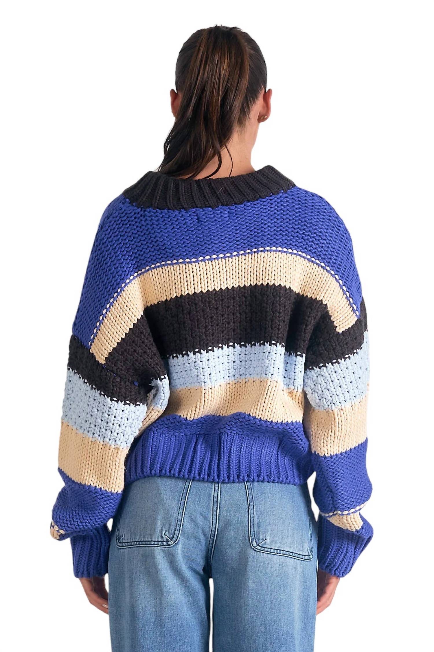 This crew neck sweater features stripes, long sleeves, and a pullover design. It has a slightly cropped silhouette and ribbed hemlines. Made from 100% acrylic.