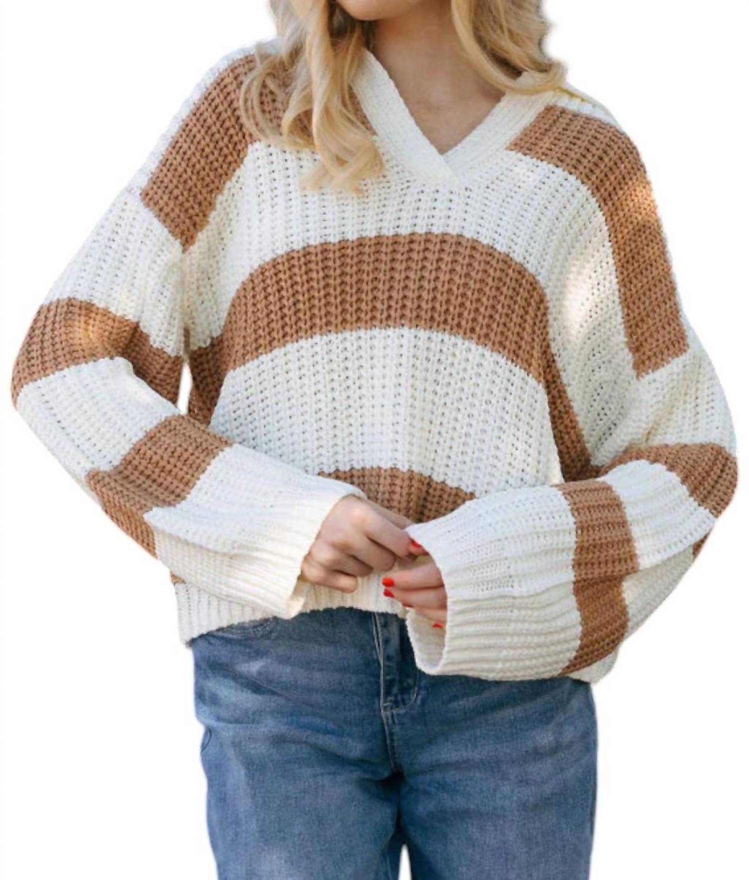 A timeless v-neck sweater that works season after season.Effortlessly chic vibe in a sophisticated camel hue. Expertly crafted from plush acrylic. Combines fashion and comfort. Relaxed oversized fit offers a laid-back yet stylish look. Designed with a flattering V-neckline and highlighted by timeless stripes. Exudes a classic yet contemporary appeal. Long sleeves ensure you stay cozy. Pull-on closure adds a touch of convenience. Simplicity infused with elegance.