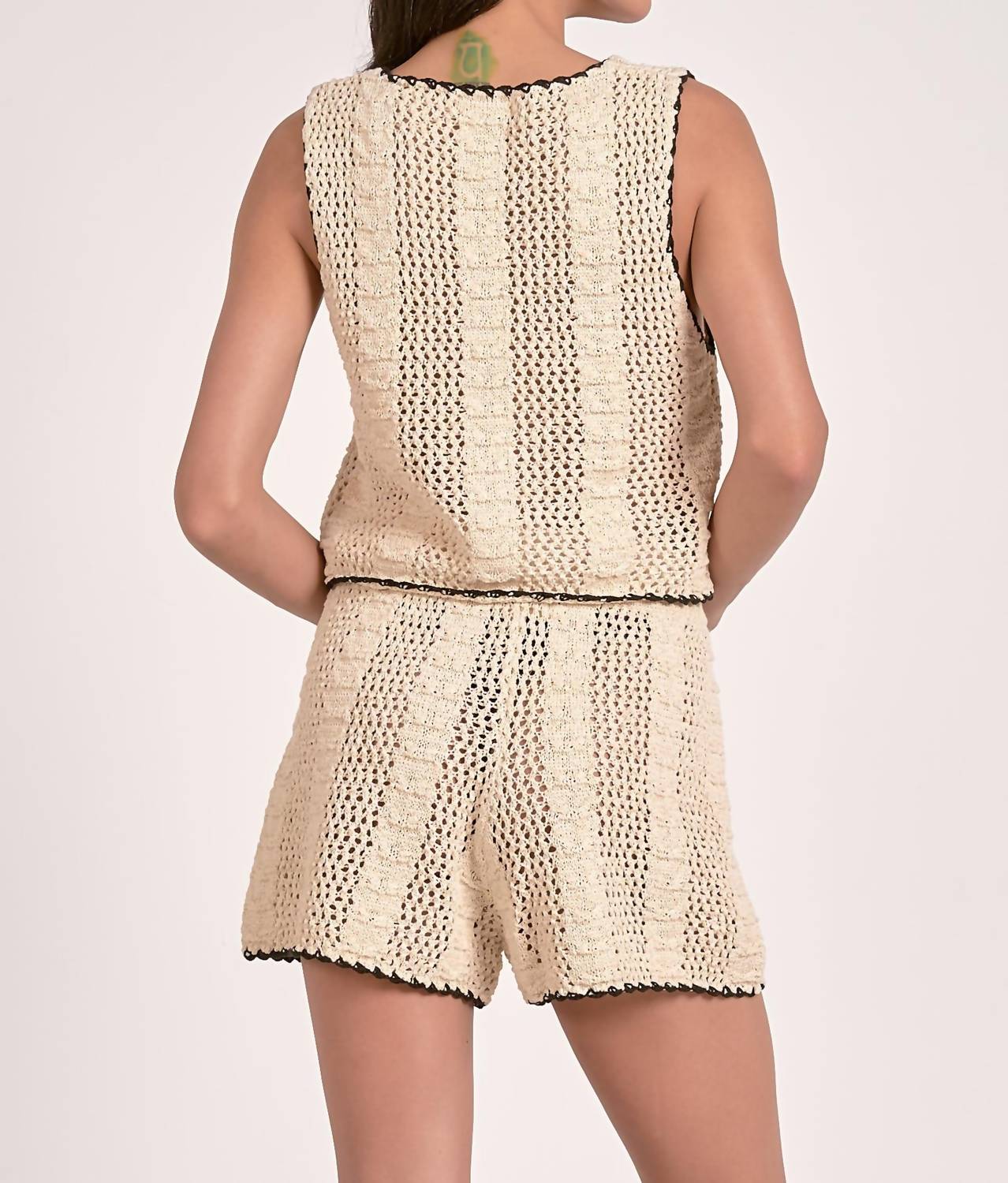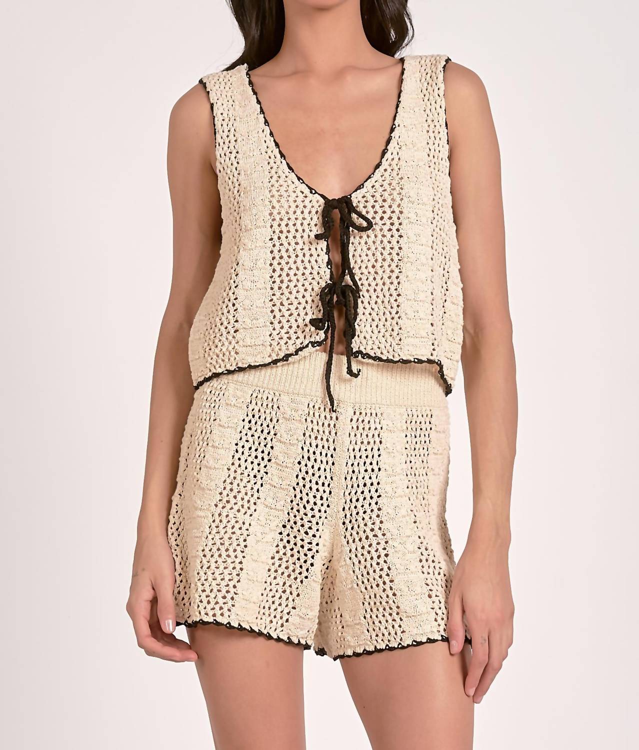 A timeless blouse that will never go out of style. Elevate your summer wardrobe with the Taja Sleeveless Top by ELAN, featuring a breezy open crochet knit and a boho-inspired striped design. Made from a comfortable cotton blend of 75% cotton and 25% polyester, this top keeps you cool and stylish in warm weather. The front-tie closure adds a touch of flair, perfectly complementing its relaxed, streetwear appeal. Care for this vacation-ready piece with hand washing to maintain its summery charm.