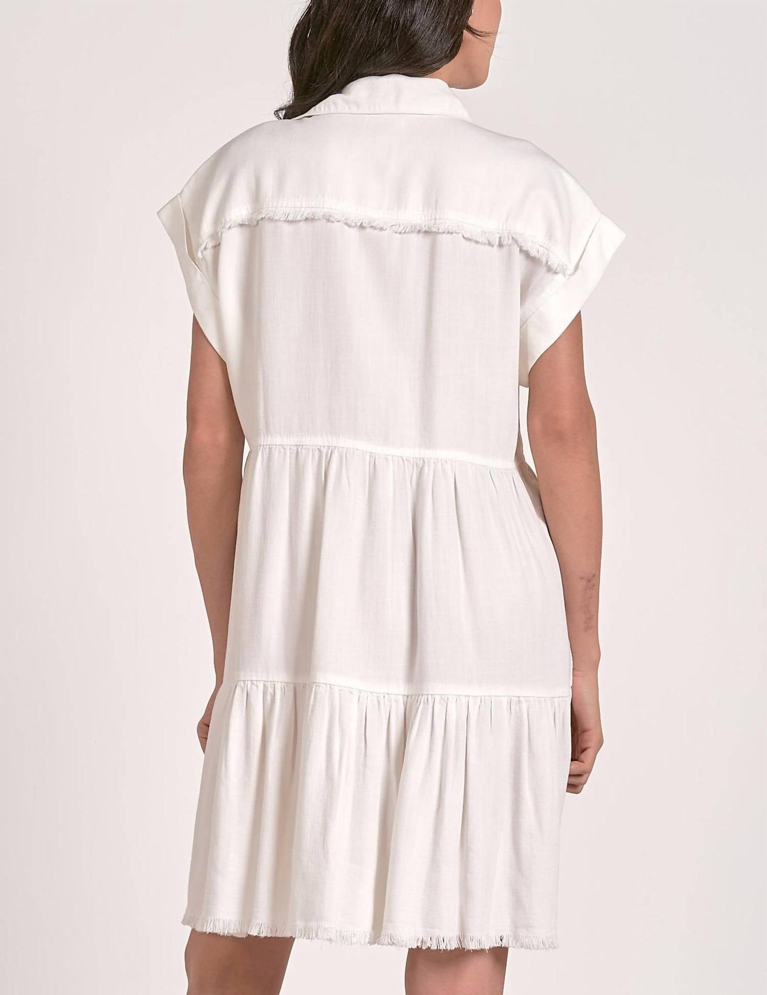 A short and breezy dress for those warmer days. The Tiered Mini Dress by ELAN, in a fresh white hue, is a sophisticated choice for the adventurous yet fashionable woman. Crafted from 100% Lyocell, this shirt dress features short sleeves and a stylish collar neckline. Its oversized fit includes practical breast pockets and a button closure, detailed with frayed edges and elegant tiered ruffles. Care for this dress by machine washing on a gentle cycle and line drying. Ideal for vacation or spring workwear occasions.