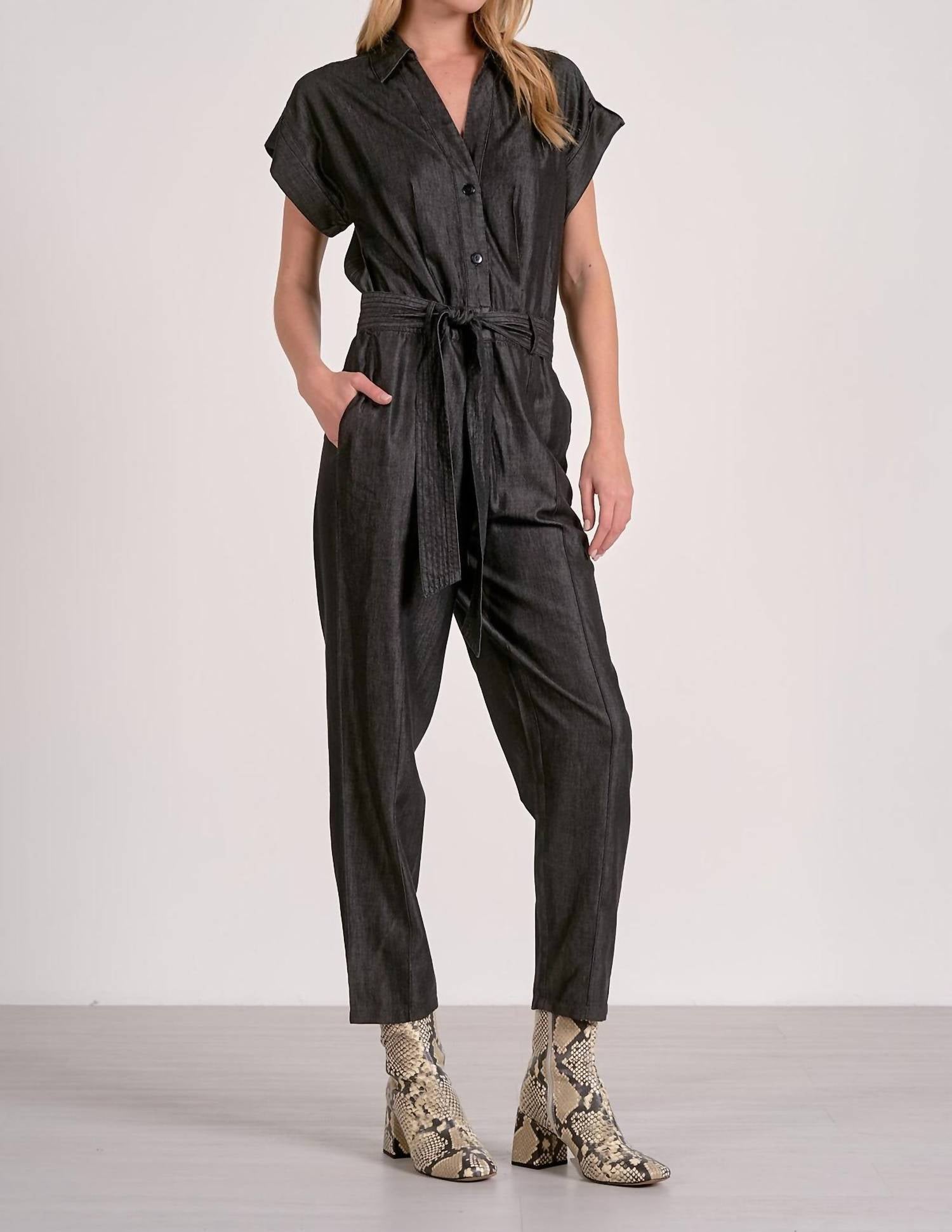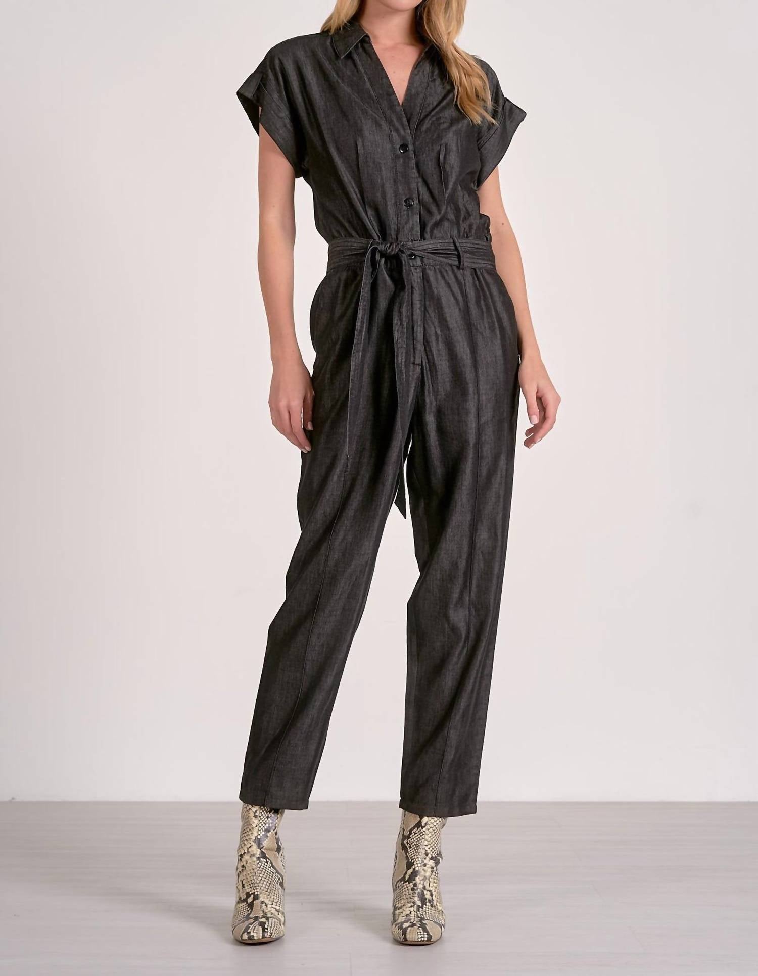 Elevate your streetwear style with the Utility Short Sleeve Belted Jumpsuit by ELAN in a chic Dark Grey Wash. This jumpsuit, crafted from a cotton blend consisting of 98% Cotton and 2% Elastane, features a solid pattern with a high-rise waist and regular-fit straight legs. Ensuring a smart silhouette, it also includes a button closure. Care instructions recommend hand washing and line drying to maintain its impeccable look.