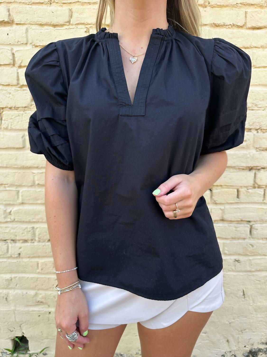 Look no further, you just found your perfect tee! Discover the V-neck Top With Bubble Sleeve by ELAN, a chic addition to your wardrobe. Designed in sleek black, this top features stylish short bubble sleeves that offer a modern twist on a classic silhouette. Closure: Pull-on. Perfect for adding sophistication to any ensemble, this piece plays well with both casual and formal pieces.