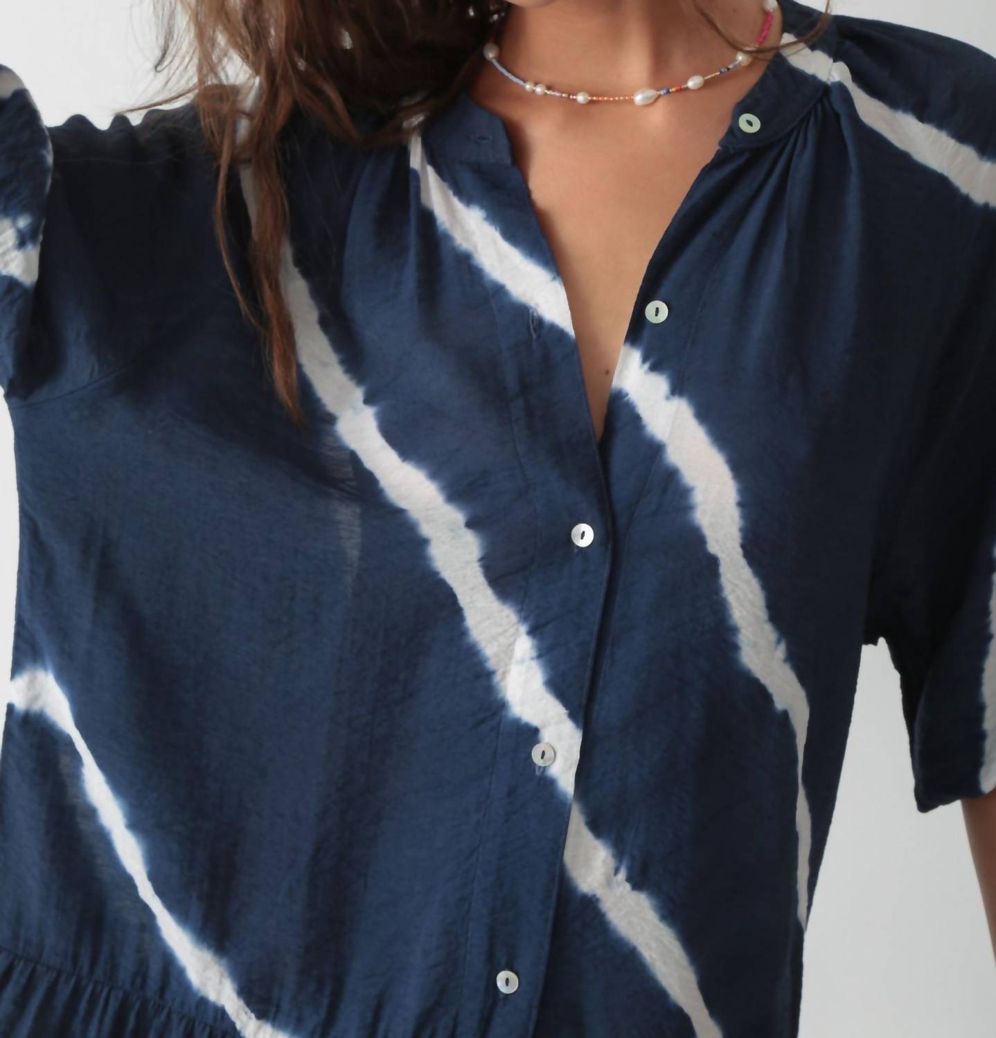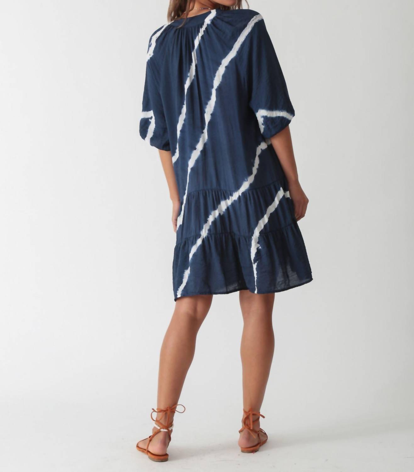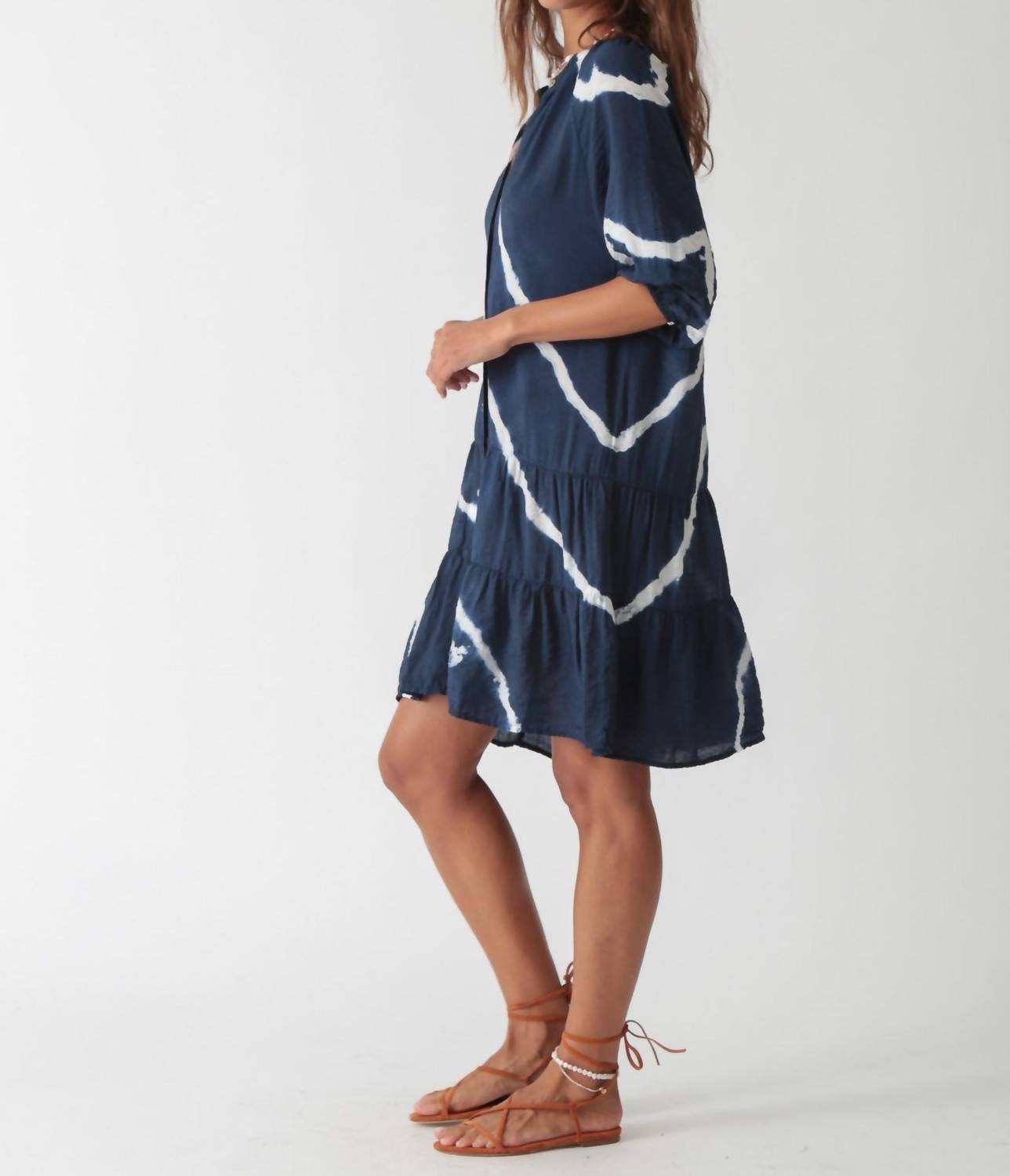 Comfortable and cute, this casual day dress has it all. The Electric & Rose Clarissa Mini Dress is a captivating piece perfect for warm-weather occasions. This short sleeve dress in an Indigo Wave colorway features a tiered A-line silhouette with a V-neck and button closure made from 84% Rayon and 16% Nylon. Each dress is hand-dyed with a tie-dye pattern in Los Angeles, USA, ensuring a unique touch. Care instructions recommend dry cleaning to maintain its exquisite look. Model is 5'9" and wearing a size small.
