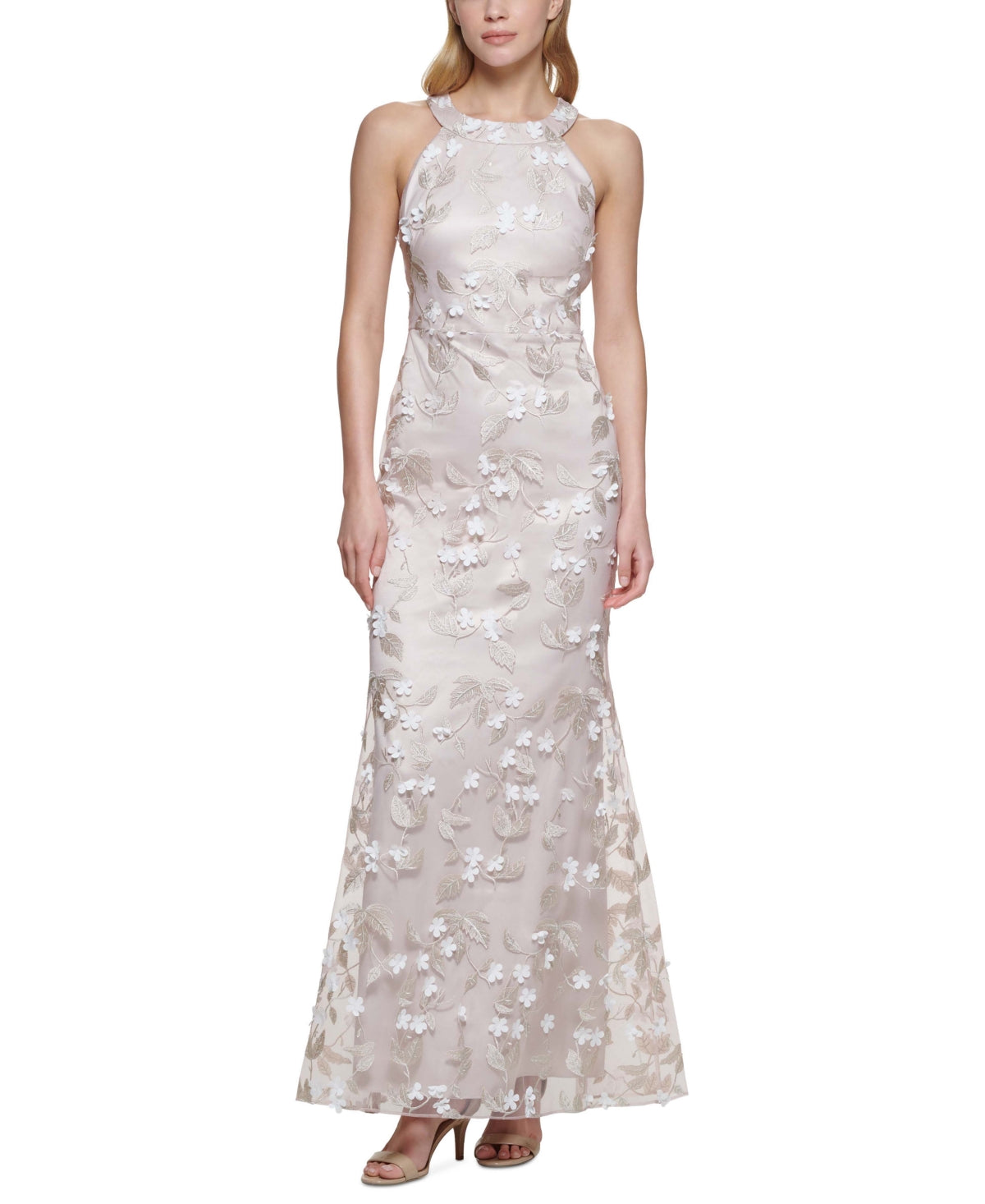 Beige/White Color | Size 2 | Floral Appliqué Design | Eliza J Brand | Purchased at Nordstrom | Elegant Gown Style | Material Blend for Comfort | Sleeveless | Fitted Bodice | Full-Length Skirt | Indented Waist | Back-Zip Closure | V-Neckline