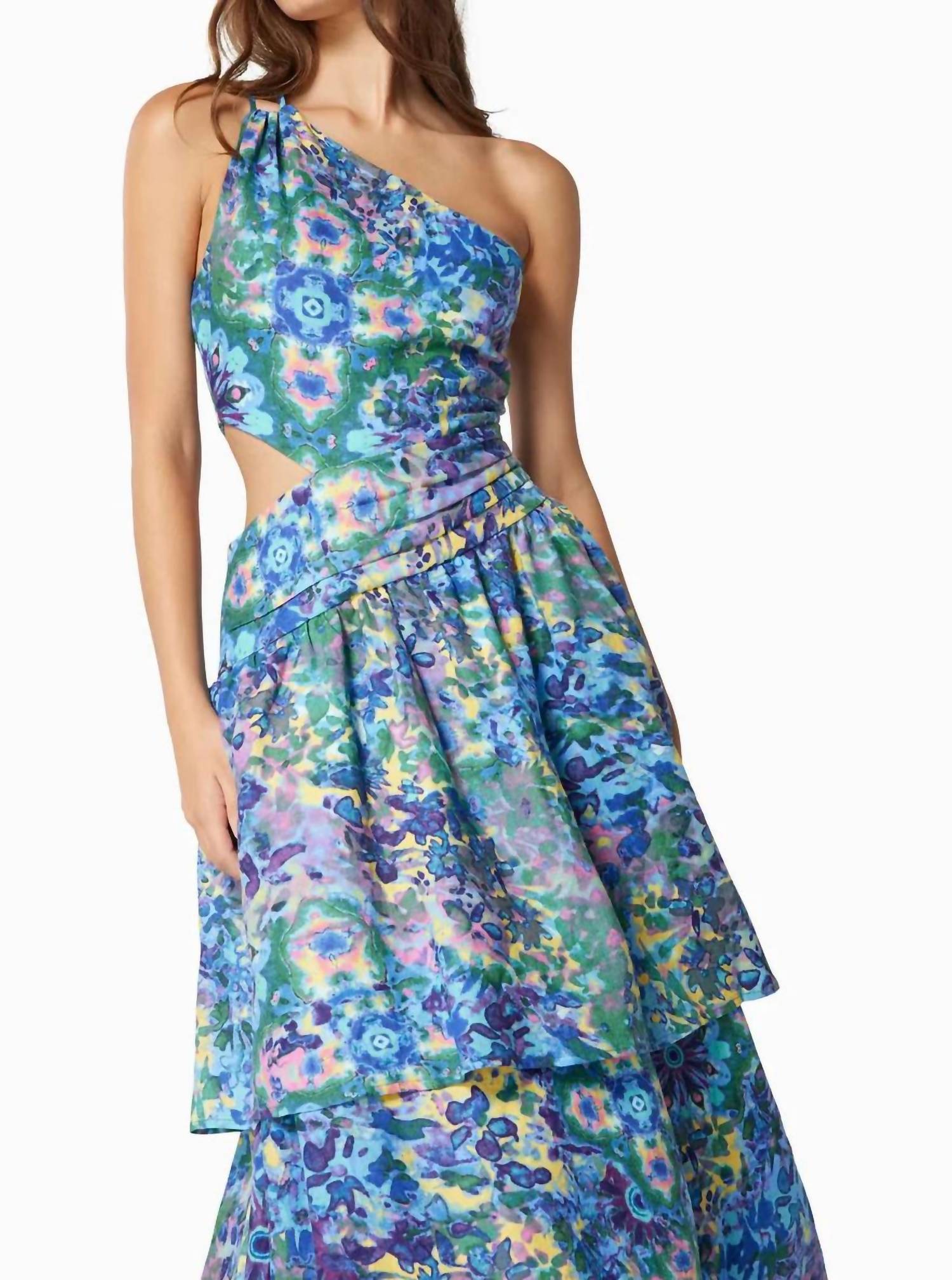 A midi dress so versatile, your options for wearing it are endless. Discover the Annabelle Midi Dress by ELLIATT, a stunning boho-chic ensemble perfect for a Thanksgiving evening event. This sleeveless dress is crafted from 100% printed linen, featuring a fit and flare silhouette with a graceful one-shoulder design. The multi-patterned fabric is accentuated with a subtle waist cut-out and a two-tier flowy skirt. Closure: Side zipper. Care: Machine wash and lay flat to dry.