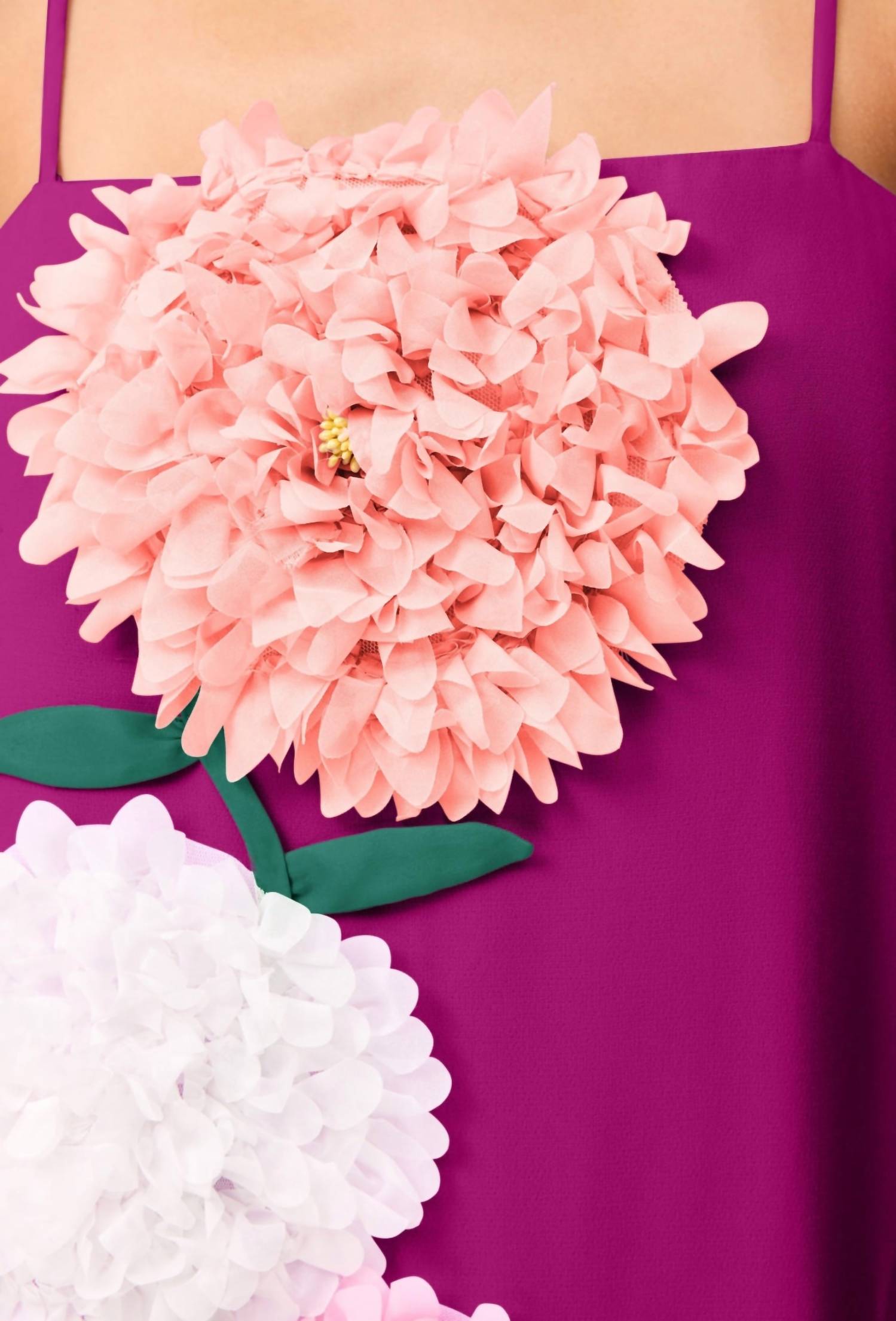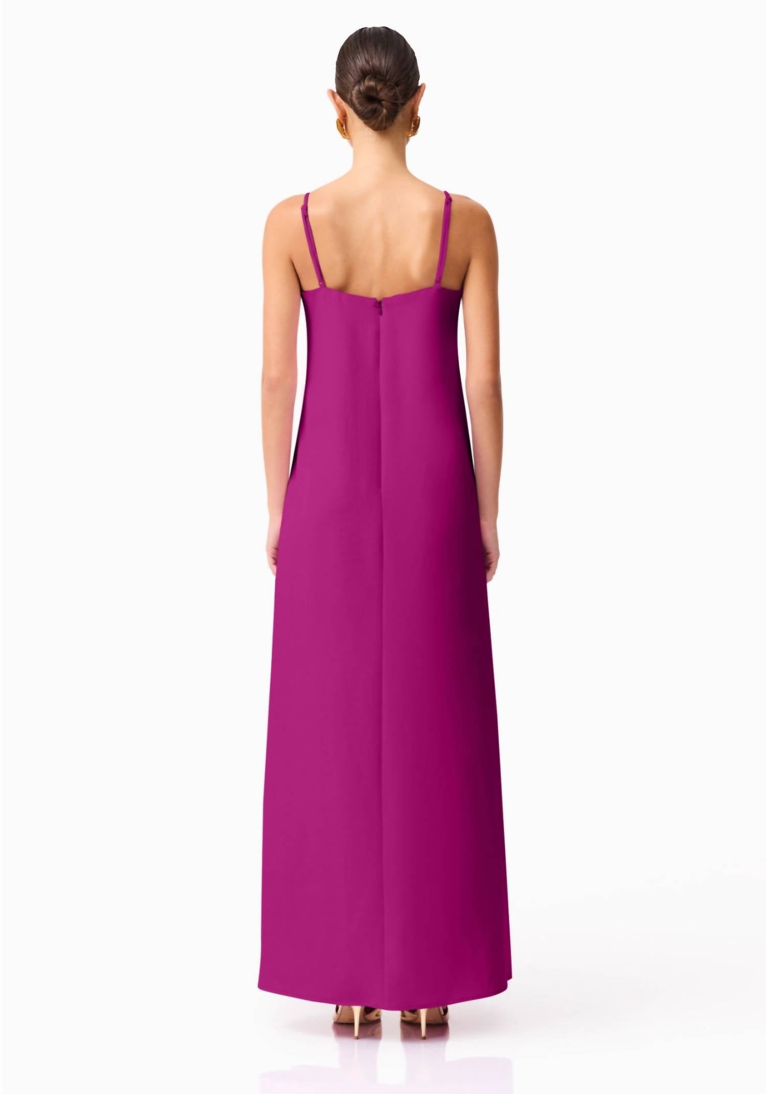 Who doesn't love a good maxi dress? This one you'll be reaching for season after season. Masterpiece of bohemian chic. Featuring spaghetti straps adorned with 3D floral embellishments. Shift silhouette captures the essence of spring in a stunning purple hue. Crafted from luxurious suiting material, ensures both structure and breathability, complete with an invisible zip closure for a seamless fit. Dry clean only, as this exquisite dress is perfect for cocktail parties and special occasions.