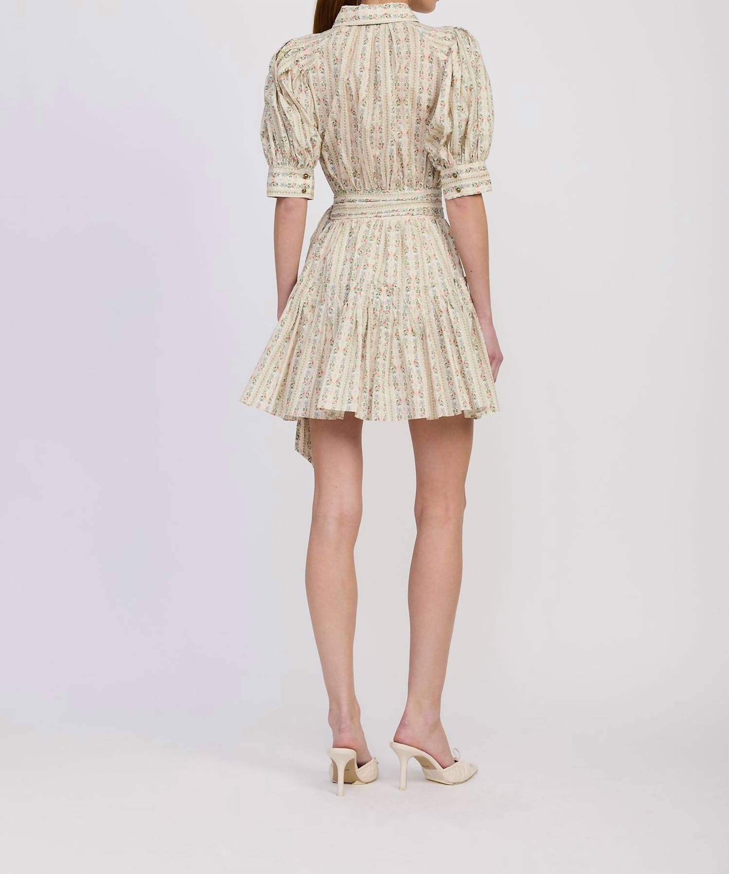 The kind of easy and flattering dress you'll be reaching for all season long. Introducing the Rosalia Mini Dress by En Saison, a chic addition to your wardrobe with elbow-length sleeves and a fit and flare silhouette. Crafted from lightweight, patterned 100% Cotton, this dress combines a classic collared neckline and a button-down front with a playful, flowy skirt. The adjustable waist tie accentuates your figure, making it a perfect choice for any occasion. Care instructions recommend hand washing to maintain its elegant style in the Ivory Olive Multi color.