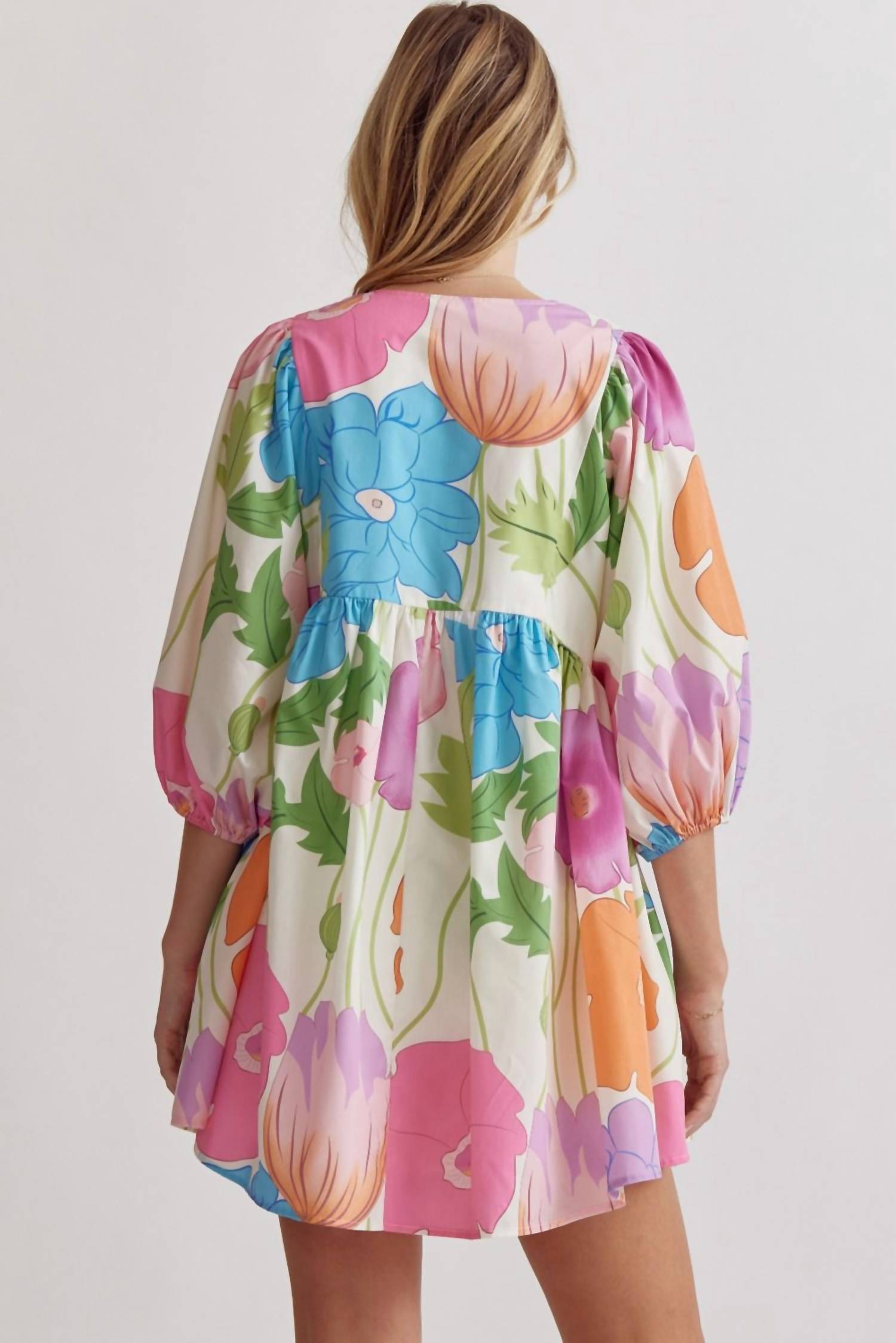 The kind of easy and flattering dress you'll be reaching for all season long.This Blossom Burst Vibrant Floral Mini Dress features a vibrant floral patterns. Its playful A-line silhouette includes a self-tie neck, side pockets, and half sleeves with elastic cuffs. Made from 95% Polyester, 5%Spandex, it offers lightweight, non-sheer comfort perfect for any warm-weather celebration. True to size.