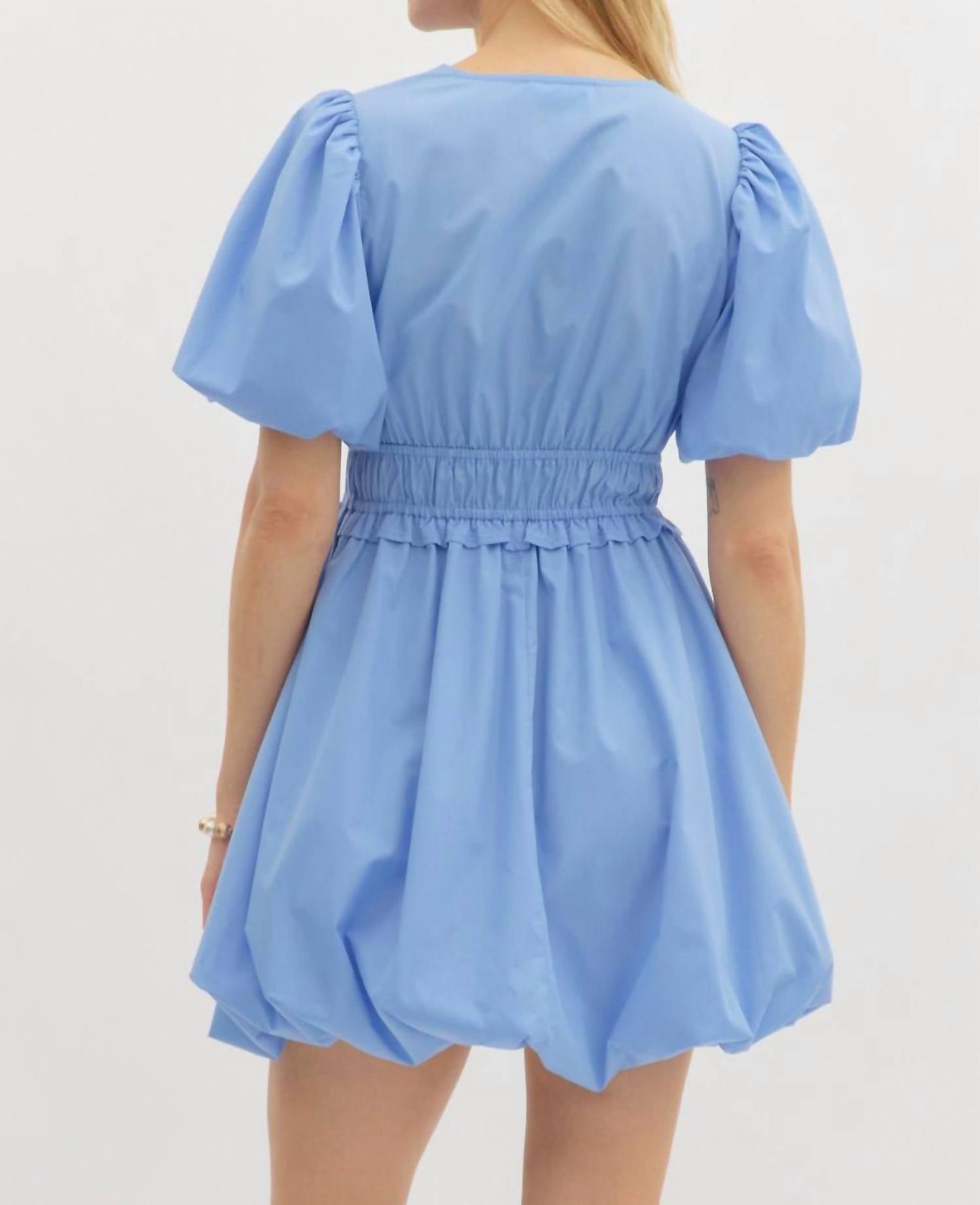 Introducing the Bow Bubble Hemmed Mini Dress by Entro, a chic choice for any summer vacation in a chambray blue. This dress features short bubble sleeves and a stylish bubble hem, complemented by a V-neckline and tie closure for added elegance. Designed with an elasticated waist and side pockets, it offers both comfort and functionality. Ideal for minimalist styles, this lightweight, woven dress is perfect for those seeking a wardrobe staple with a playful twist.