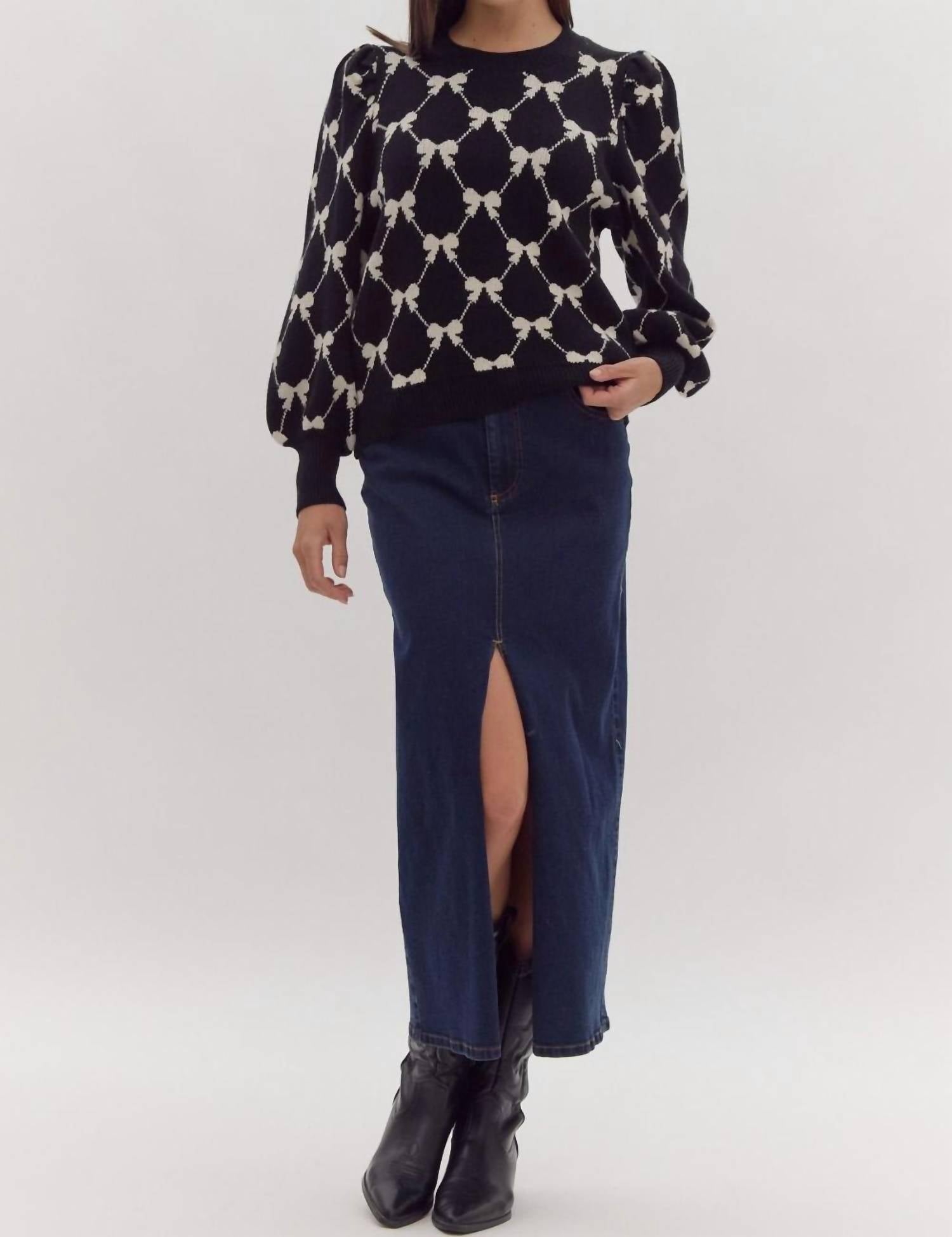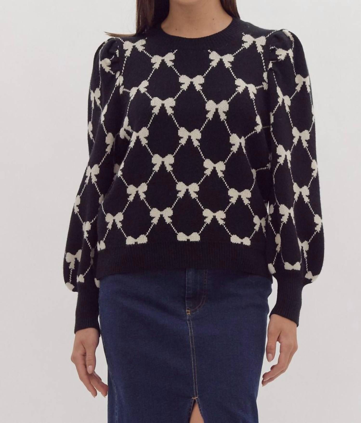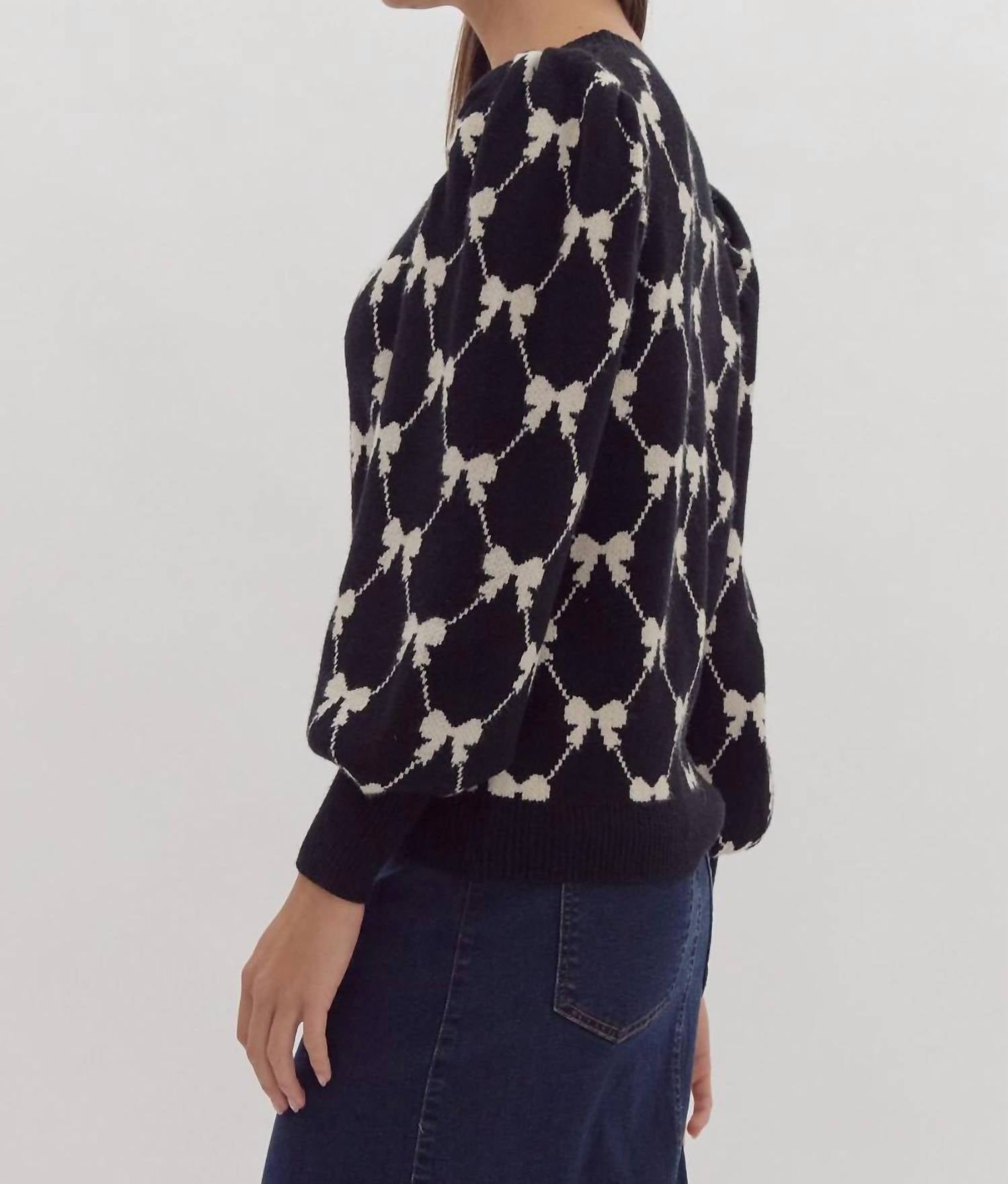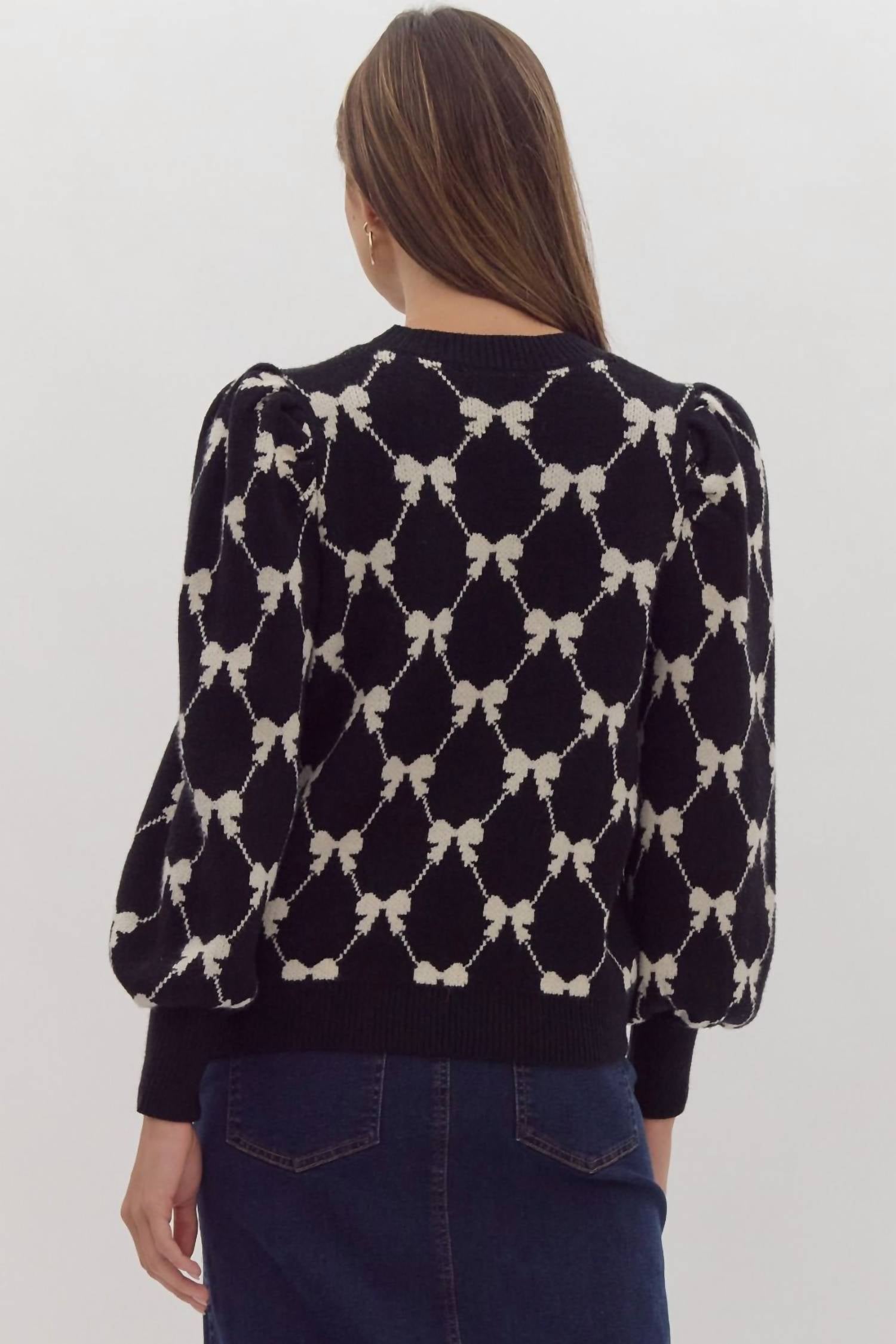 Throw this adorable cardigan over any cami or tank top. Elevate your wardrobe with the Bows Forever Sweater by Entro, a charming piece in classic black that is perfect for any occasion. This long sleeve sweater is crafted with a comfortable, lightweight viscose blend featuring a playful coquette bow print. It's designed with ribbed cuff and hem details for added style and a flattering fit. Closure: Pull on. Composition: 50% Viscose, 28% Polyester, 22% Nylon. Care: Hand wash cold, lay flat to dry.
