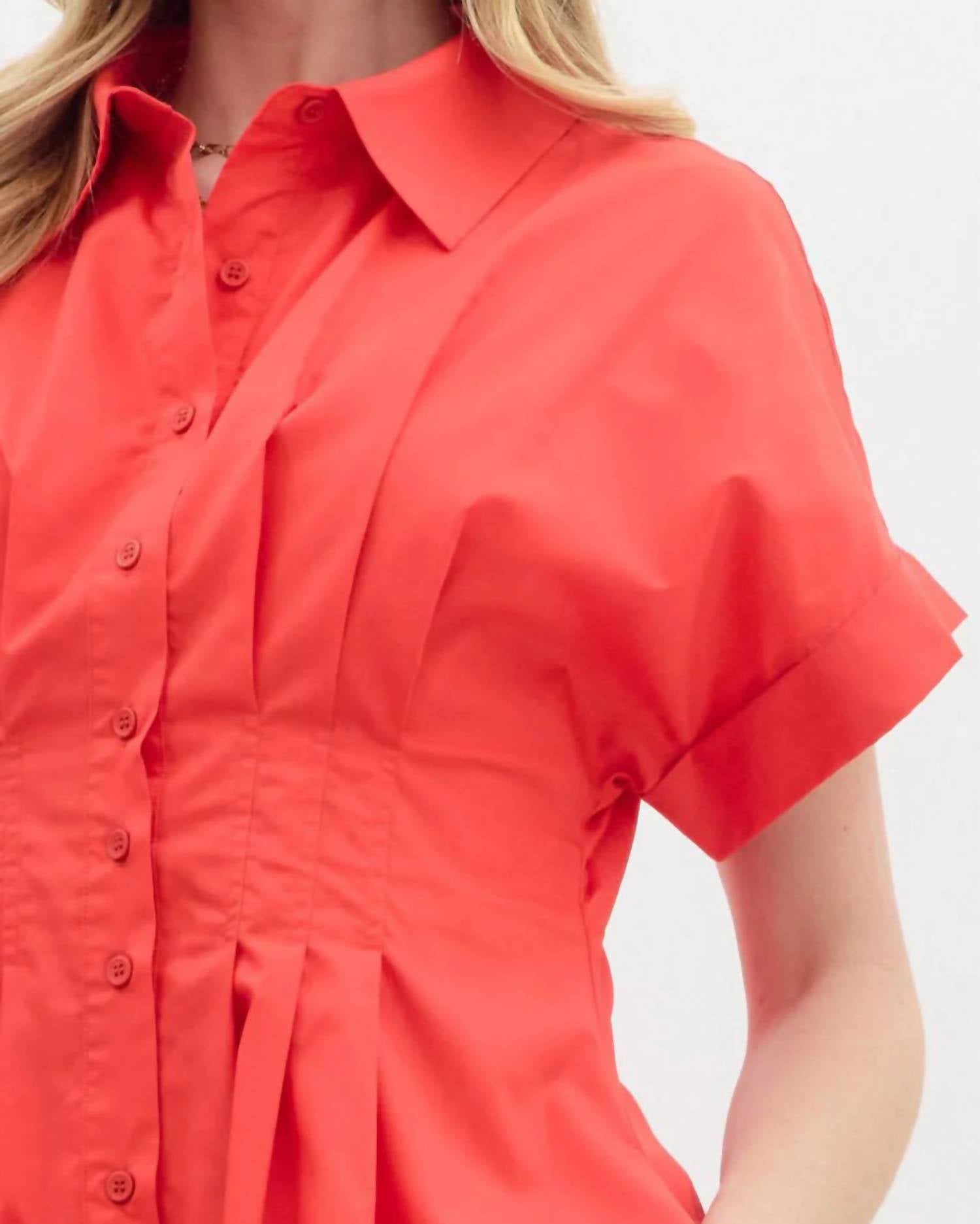 Embrace a chic summer style with the Red Button Front Pleated Dress by Entro, perfect for Valentine's Day or any occasion. This mini dress features short sleeves and a classic shirt collar with convenient button closure. Crafted from a soft cotton blend, it showcases a pleated waist and practical side pockets. Composition: 80% Polyester, 20% Cotton. Care: Machine wash and tumble dry, ensuring effortless maintenance.