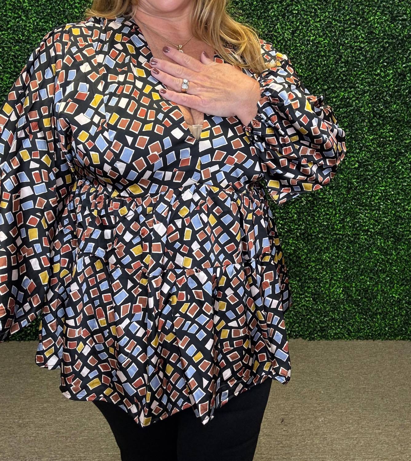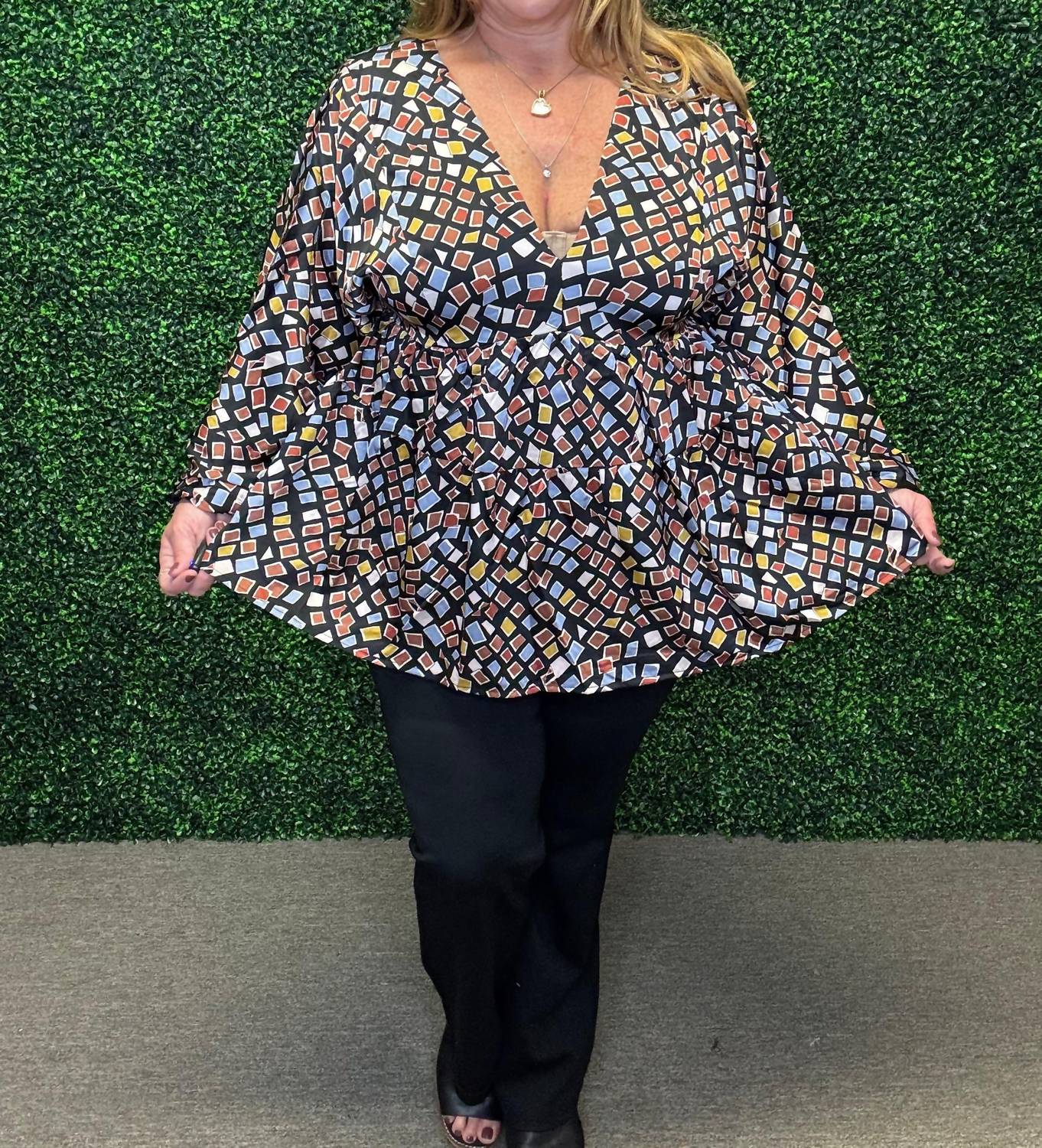 Pair this with your favorite jeans and slides for your next girls night out. The Check Me Out Blouse by Entro is a stylish choice that blends bold design with comfort. Featuring long sleeves and a flattering deep V-neckline, this blouse brings a playful edge with its distinctive square pattern. Made from 100% polyester, it features a lined, non-sheer breathable fabric for ultimate comfort and ease. With a pull-on closure, this blouse requires easy care—hand wash cold and lay flat to dry. Perfect for any occasion, it offers plus-size options and fits true to size, with a size L comfortably fitting a bra band size of 38–40".