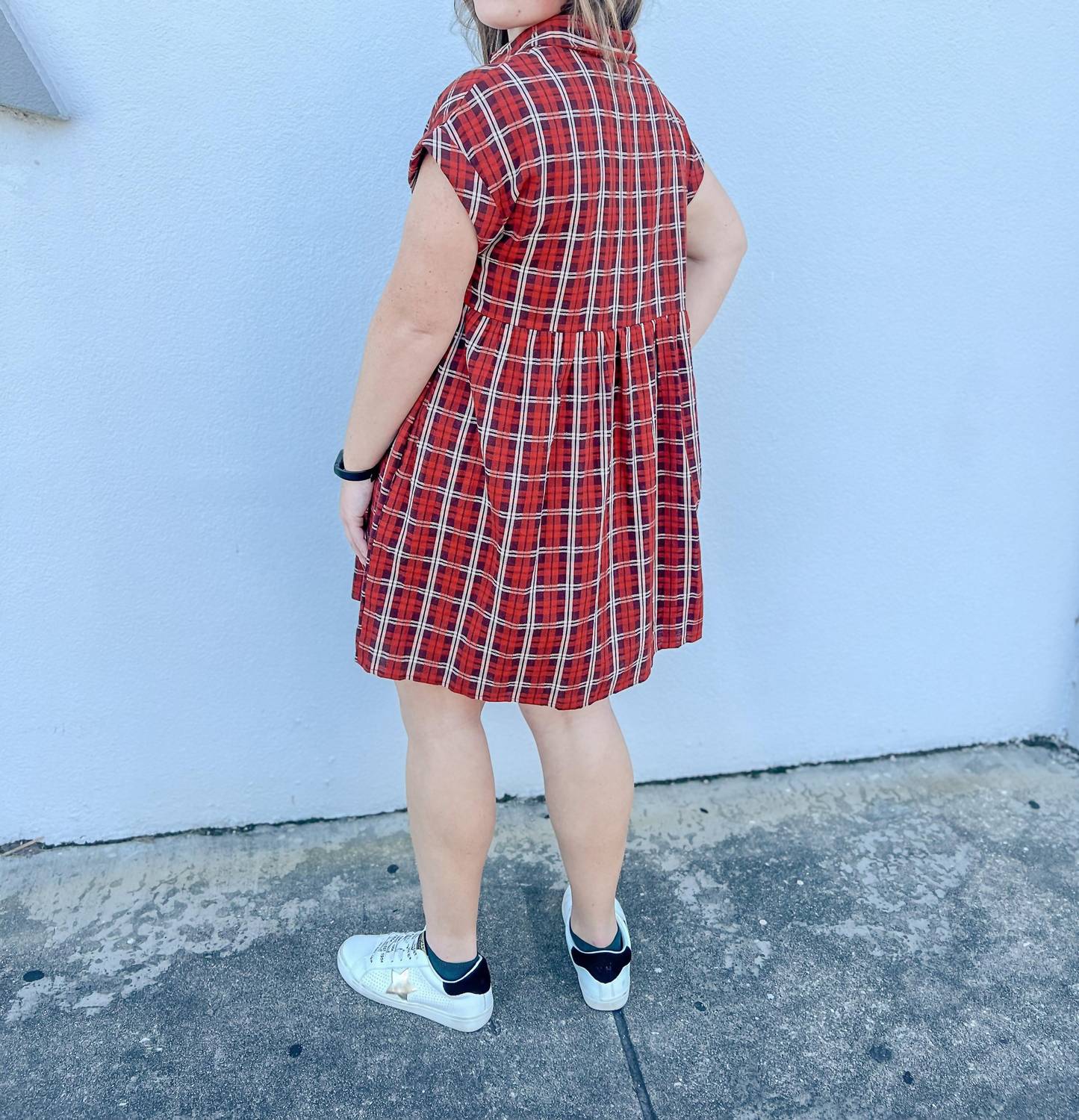 A short and breezy dress for those warmer days. The Classic Charm Plaid Mini Dress by Entro combines timeless style with contemporary design, perfect for versatile day-to-day wear. This short sleeve dress is crafted from breathable 100% cotton with a classic red plaid print. It features a crisp collared neckline, practical side pockets, and a convenient button closure. Designed with slightly oversized fit, this dress gives you confidence with its woven, lined fabric. Model Lauren is 5'3" and size 8, wearing a small.