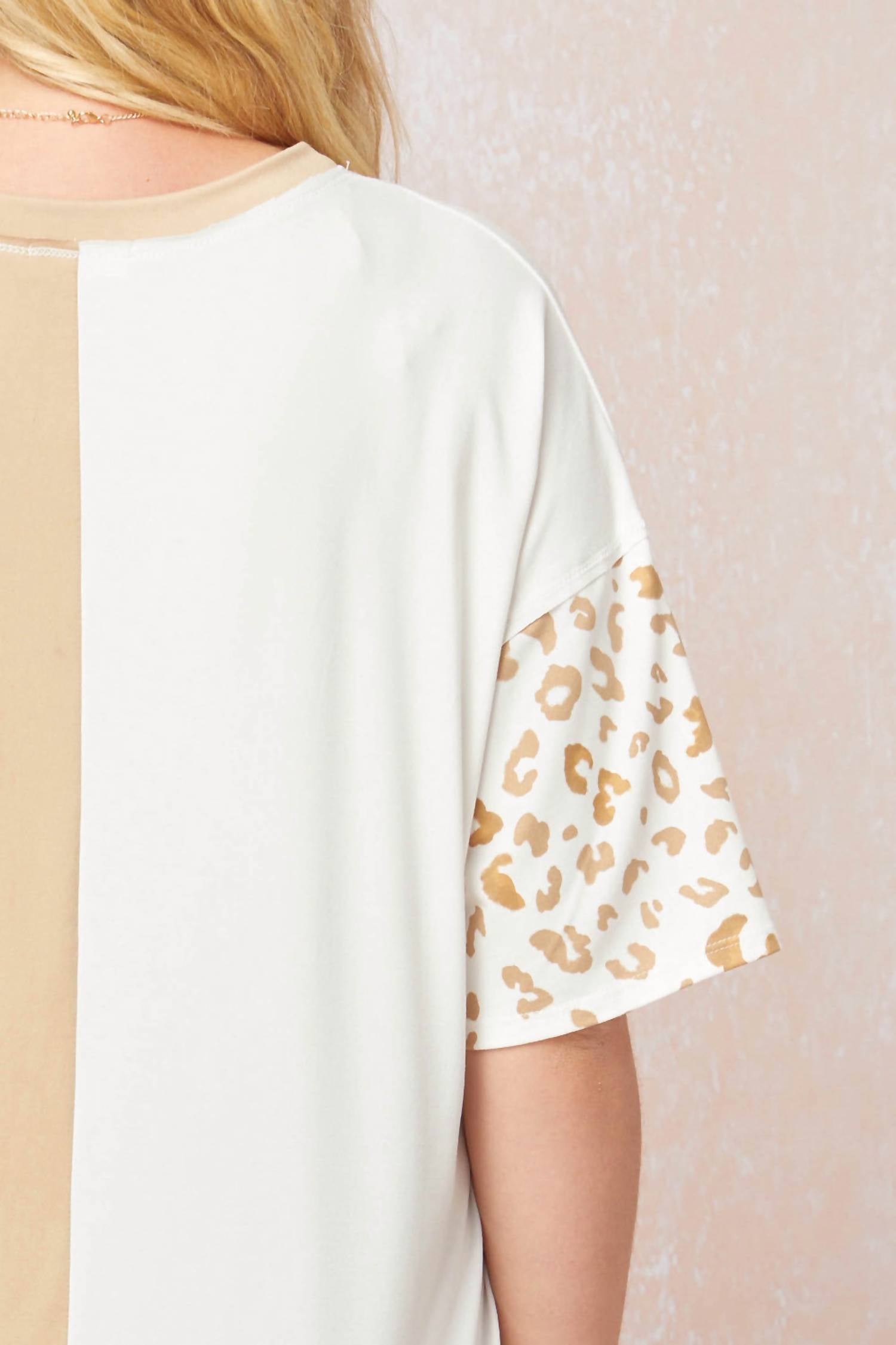 Pair this with your favorite jeans and slides for your next girls night out. Introducing the Entro Color Block Leopard Top, a trendy camel blouse designed for those seeking style and comfort. This top features short sleeves, a playful leopard print, and a relaxed V-neckline, complemented by outside seams and a color block design. Made from a soft and stretchy blend of 96% Polyester and 4% Spandex, it offers a flattering silhouette with dimensions available up to a 2X Bust 52" and Length 30". Crafted in the USA, this pull-on blouse is best maintained with a hand wash or dry clean.