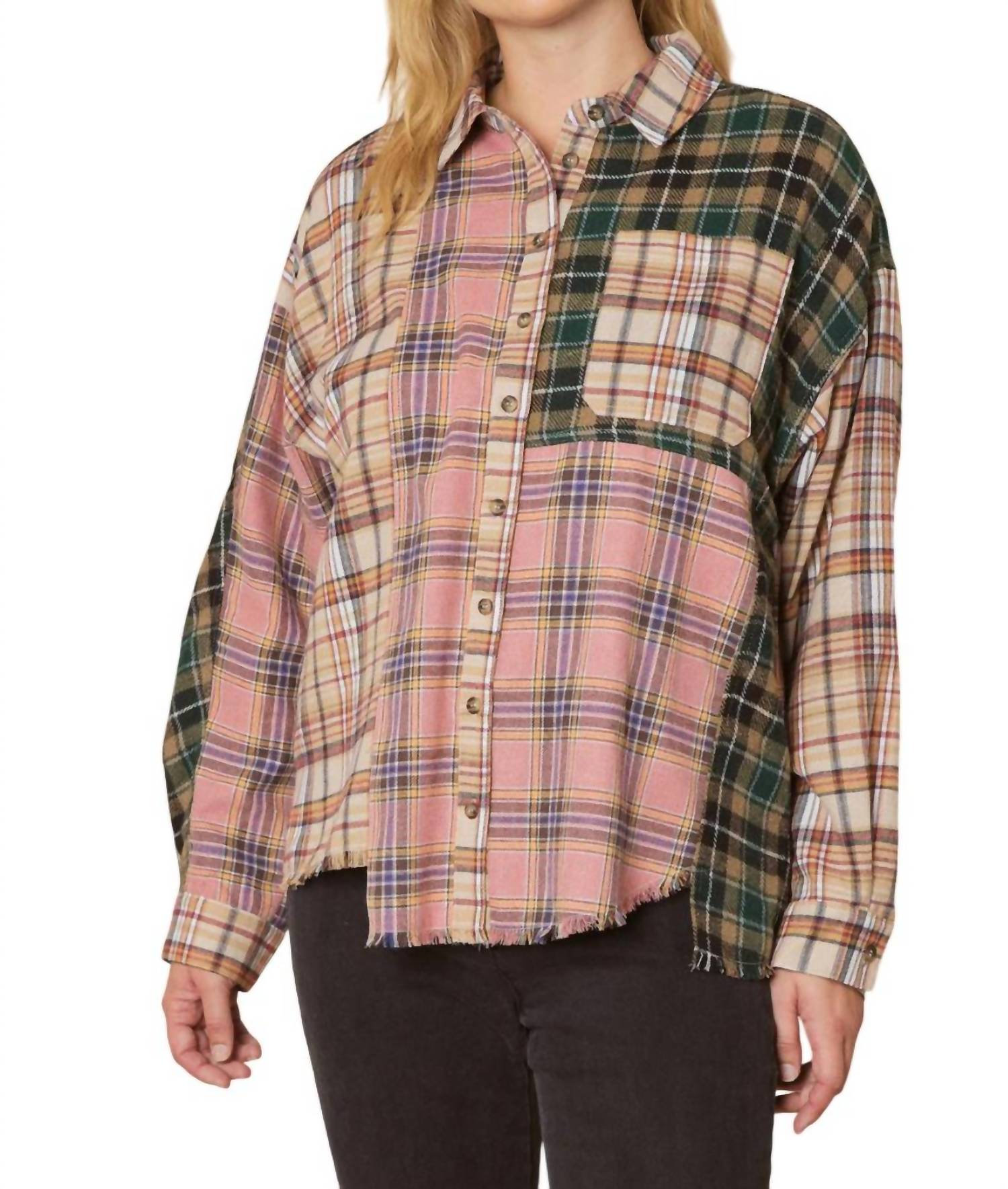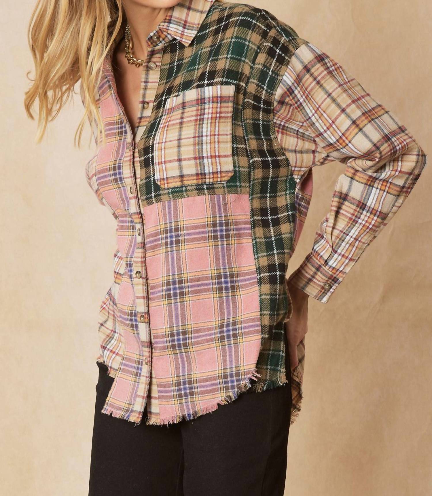 This top features a classic collar. Button-down front. Long sleeves. One chest pocket. Side slits. Raw asymmetrical hemline. High-low silhouette. Small Bust 46" Length 29". Medium Bust 48" Length 29". Large Bust 50" Length 29". XL Bust 52" Length 30". 1X Bust 54" Length 30". 2X Bust 56" Length 30". 67% Polyester 33% Cotton. Color Taupe Multi. No stretch. Hand wash or dry clean.