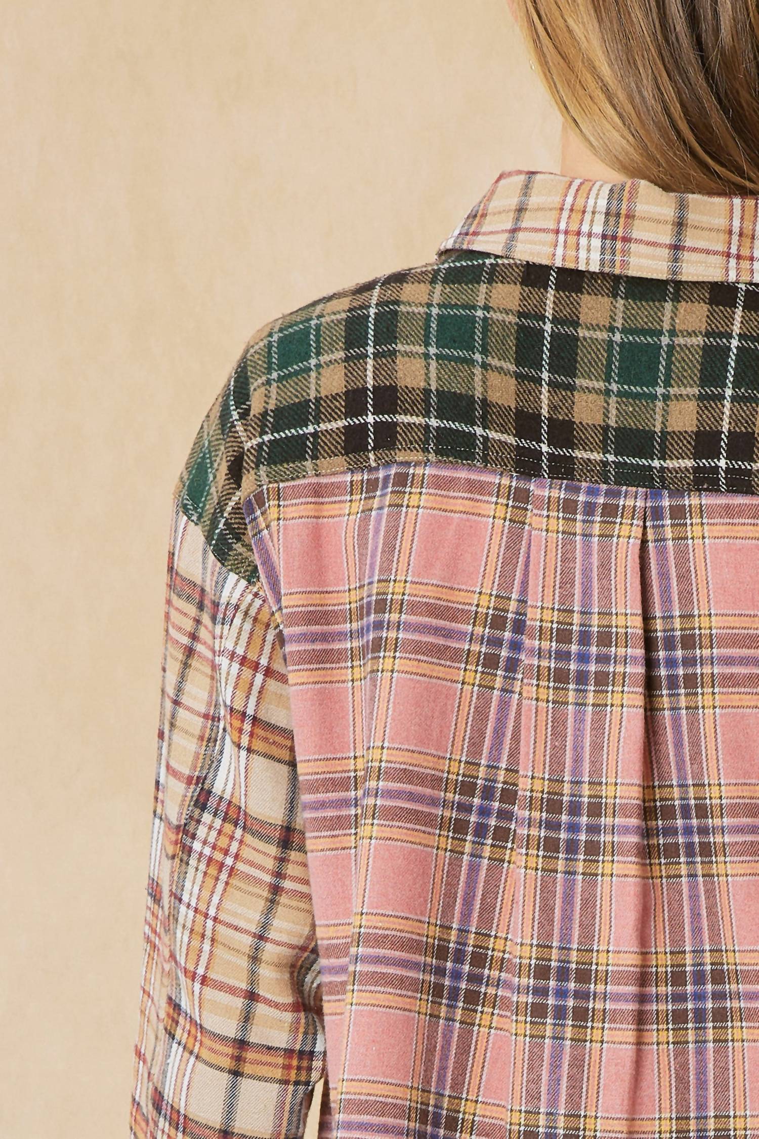 Perfectly tailored and soft to the touch. This top features a classic collar. Button-down front. Long sleeves. One chest pocket. Side slits. Raw asymmetrical hemline. High-low silhouette. Small Bust 46" Length 29". Medium Bust 48" Length 29". Large Bust 50" Length 29". XL Bust 52" Length 30". 1X Bust 54" Length 30". 2X Bust 56" Length 30". 67% Polyester 33% Cotton. Color Taupe Multi. No stretch. Hand wash or dry clean.